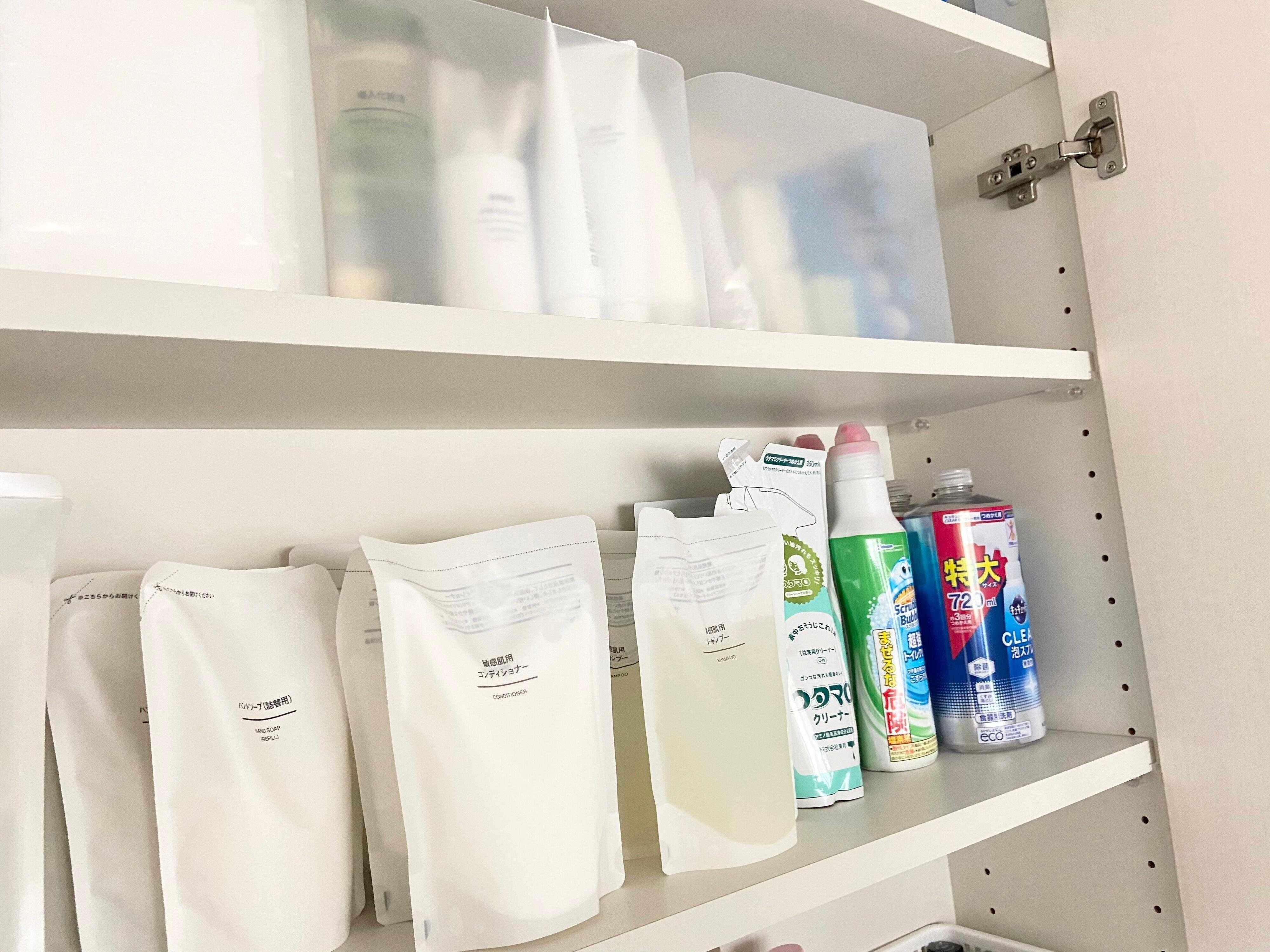 なくても問題ないように感じるかもしれませんが、これがあるとないとでは大違いなんです。このボックスを置くことで定位置を確保し、かつ倒れてくるのを防止しています。また写真では見えないのですが、洗濯洗剤、漂白剤、オキシクリーンの3つのボトルと洗濯ネットを2つ収納しています。