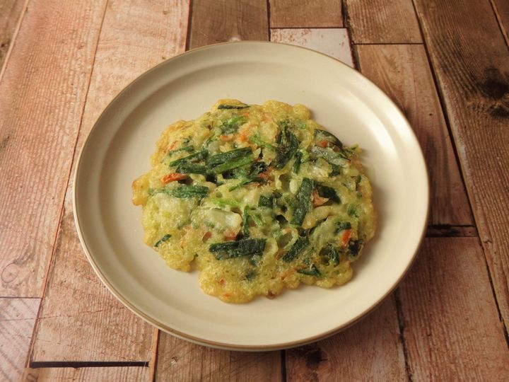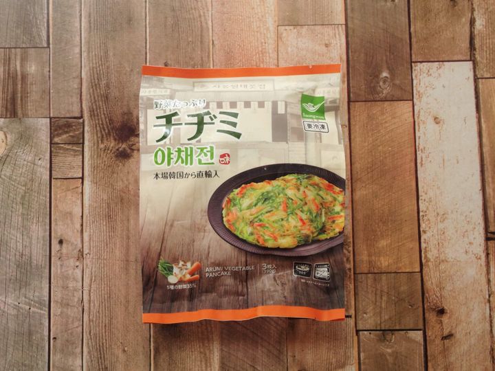 本場韓国直輸入のチヂミが電子レンジで簡単に調理できます。厚みのあるチヂミが3枚入りで、ニラ、人参、玉葱、ネギ、エリンギの5種類の野菜がたっぷり入っています。