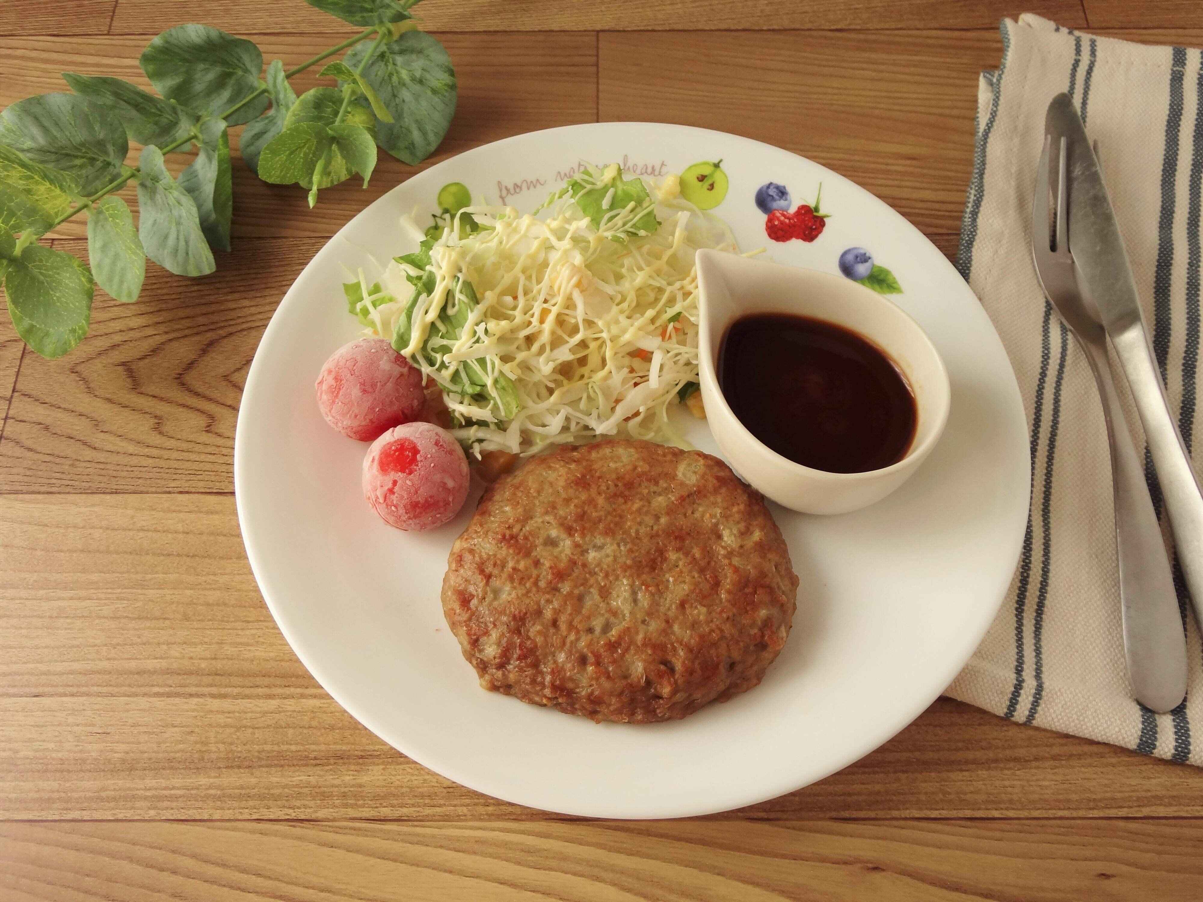 粗挽きのハンバーグなので食べ応えがあります。ハンバーグ自体にも味はついているので、このまま食べても美味しいですが、お好みでデミグラスソースやさっぱりとポン酢で食べるのもオススメ。