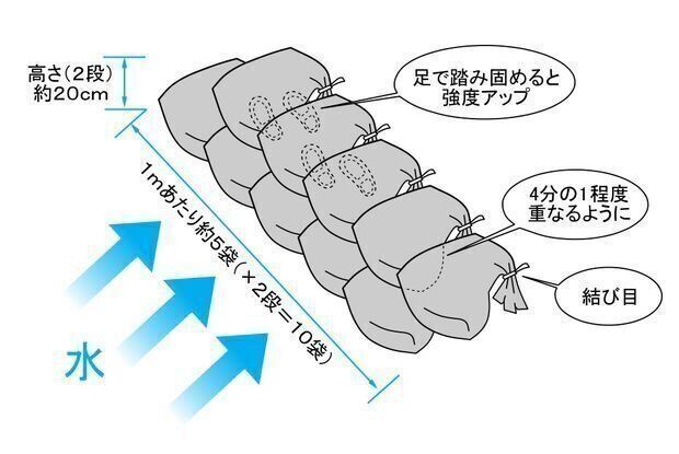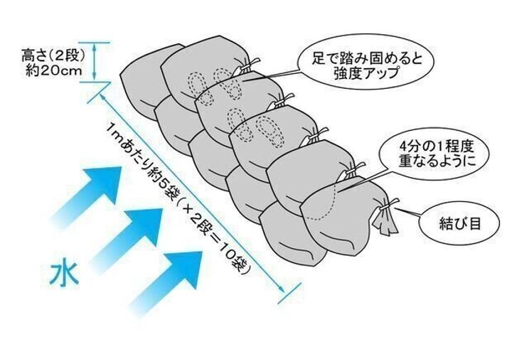 ・隙間をなくすために土嚢を足で踏み固めたり、ブルーシート等で包んだりすると効果的