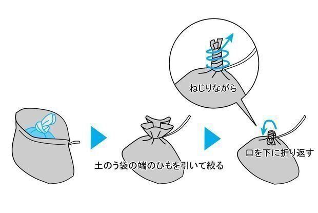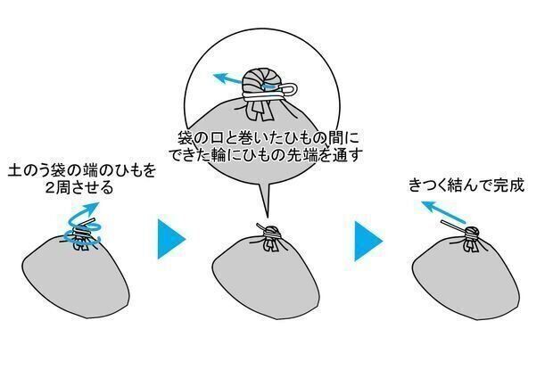 3 土嚢袋の端のひもを引いて絞る。ねじりながら口を下に折り返し、ひもを2周させる