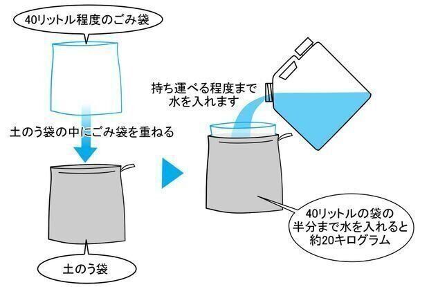 1 土嚢袋の中にごみ袋を重ね、自分で持ち運べる程度まで水を入れる