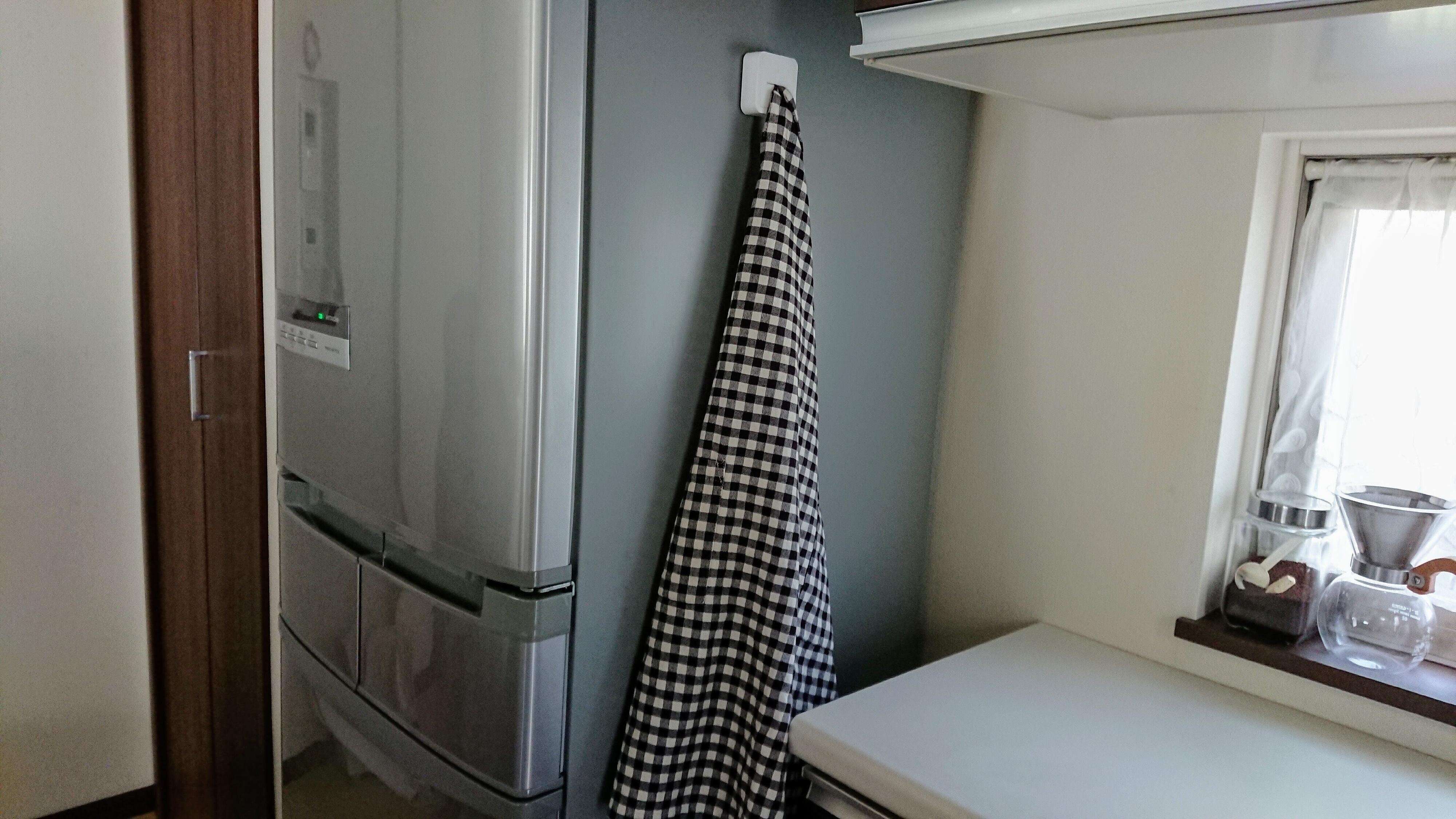 「タオルホルダー」を使えば、冷蔵庫脇などにサッとかけられるエプロン収納のできあがりです。「見せる収納」として、ワンアクションでサッとすぐに取り出せるのがいいですね。