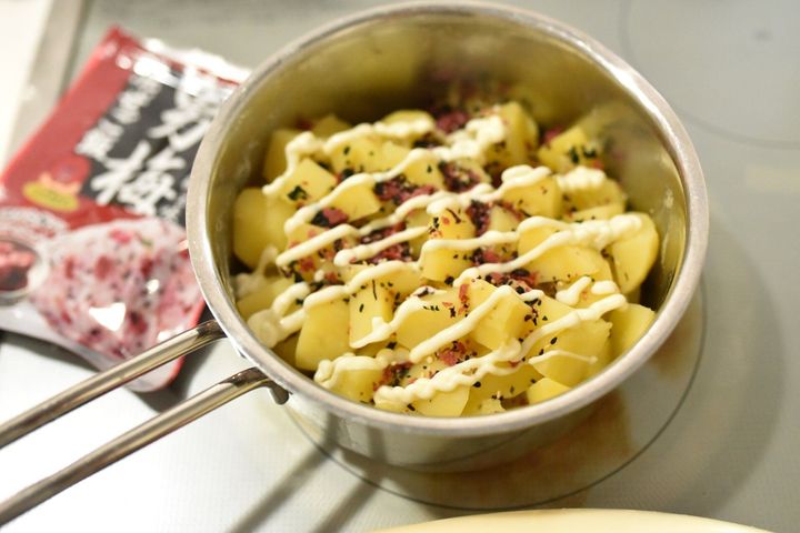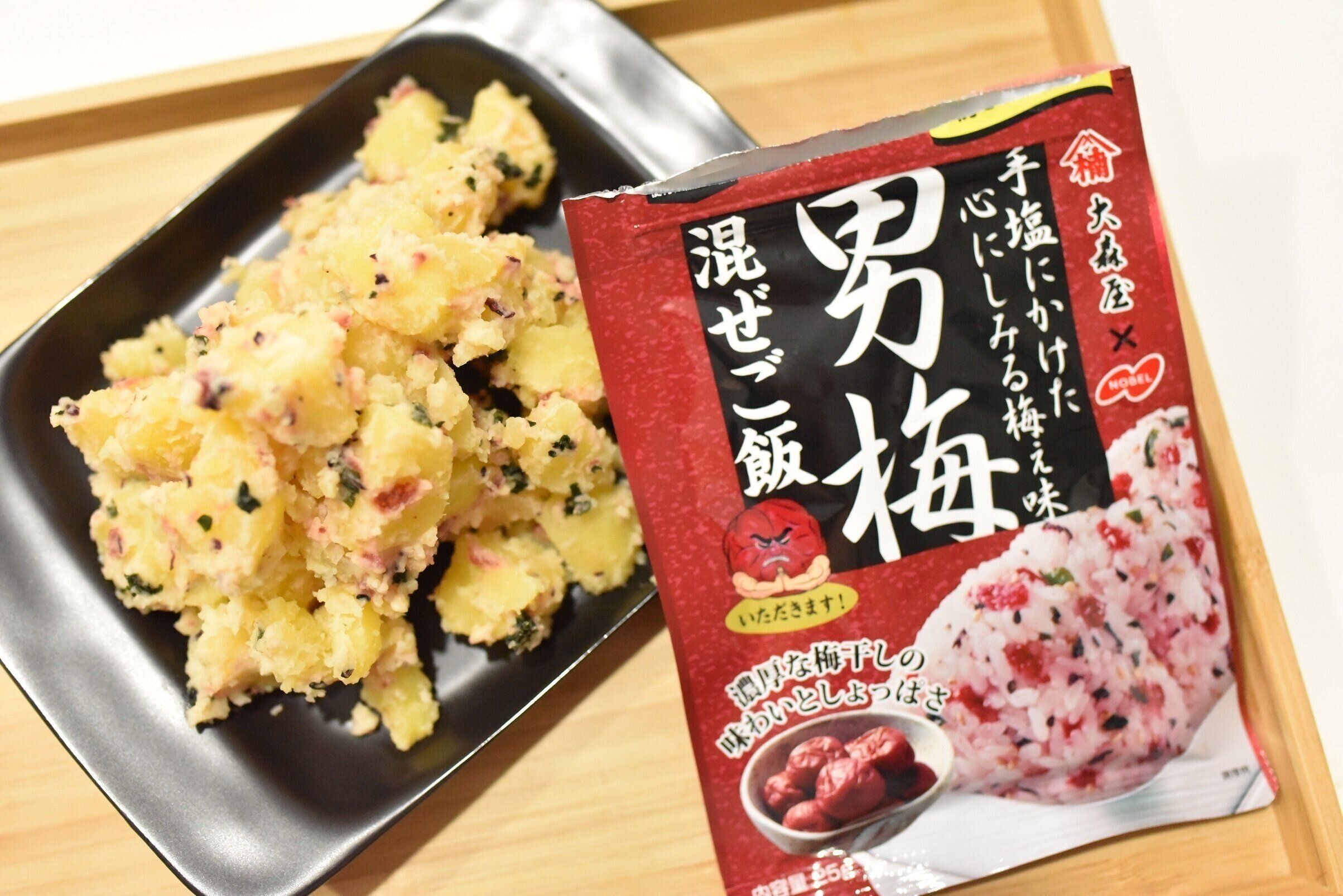 角切りにしてゆでたジャガイモに、男梅ふりかけとマヨネーズを適量混ぜるだけ。