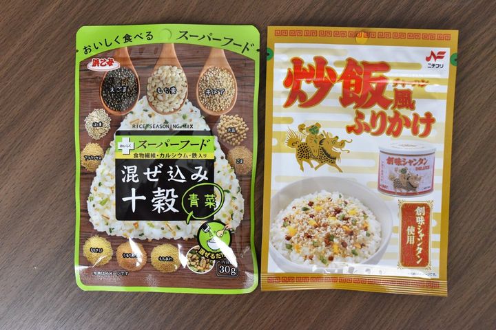写真左側の「混ぜこみ十穀青菜」は、十穀のサクサクとした食感と、青菜のシッカリとした味わいがクセになる味。おいしいものを食べながら、穀類から食物せんいやカルシウム、鉄などを摂取できていると思うと、とてもうれしいふりかけです。