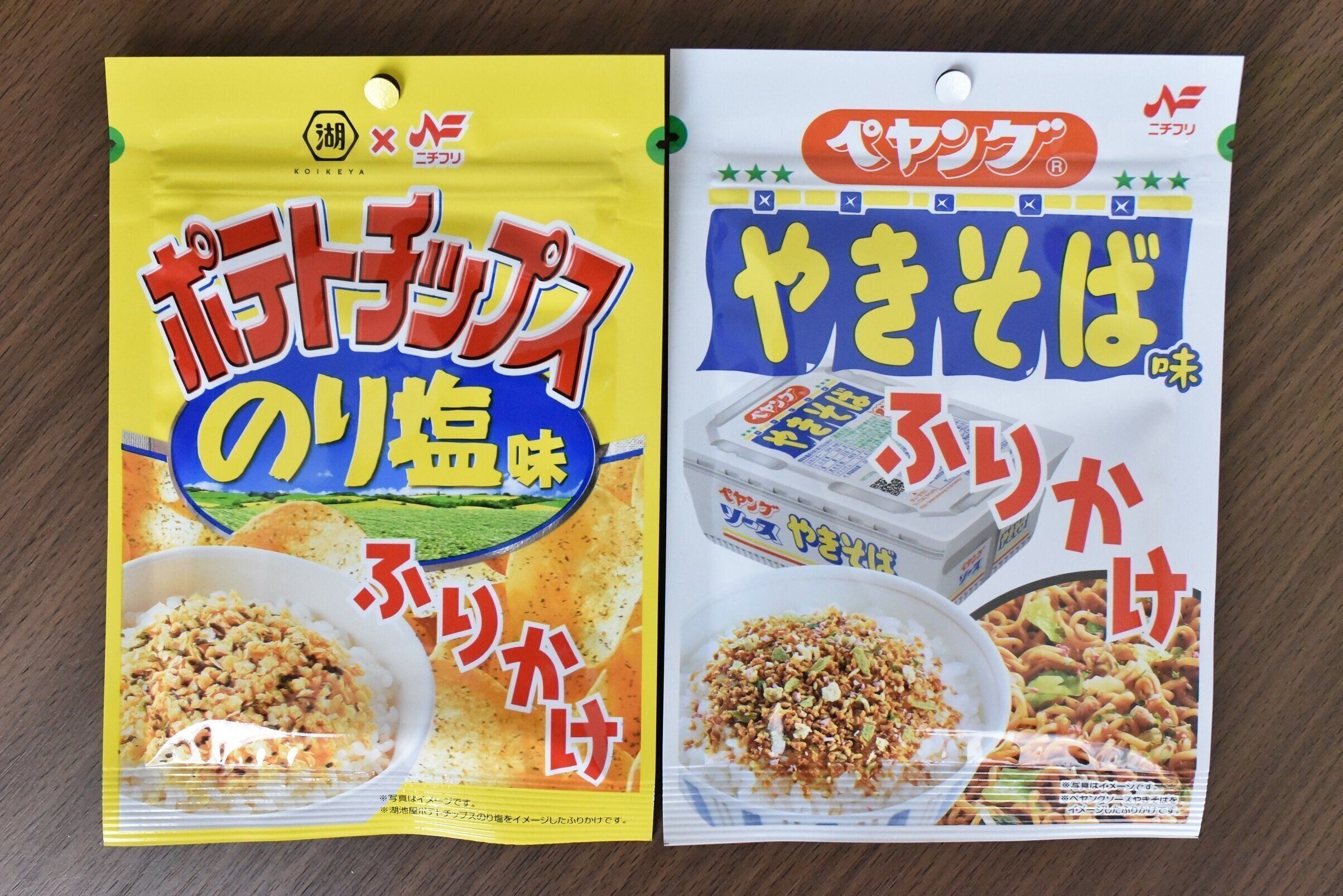 まずはこちらの2商品。ポテトチップスにカップ焼きそば味のふりかけ。どんな味なのだろう~ご飯に合うのかな~と好奇心が刺激されます。