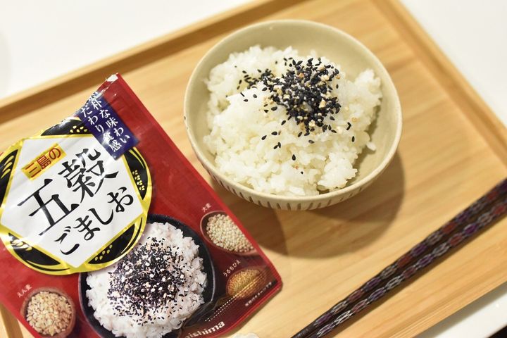 ゴマの香りのほかに五穀の香ばしい香りと歯ごたえがプラスされ、もう1杯食べたくなる味です。おにぎりにする場合は、表面にまぶしたほうが、穀類の歯ごたえを感じられておいしいです。