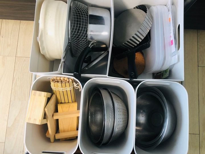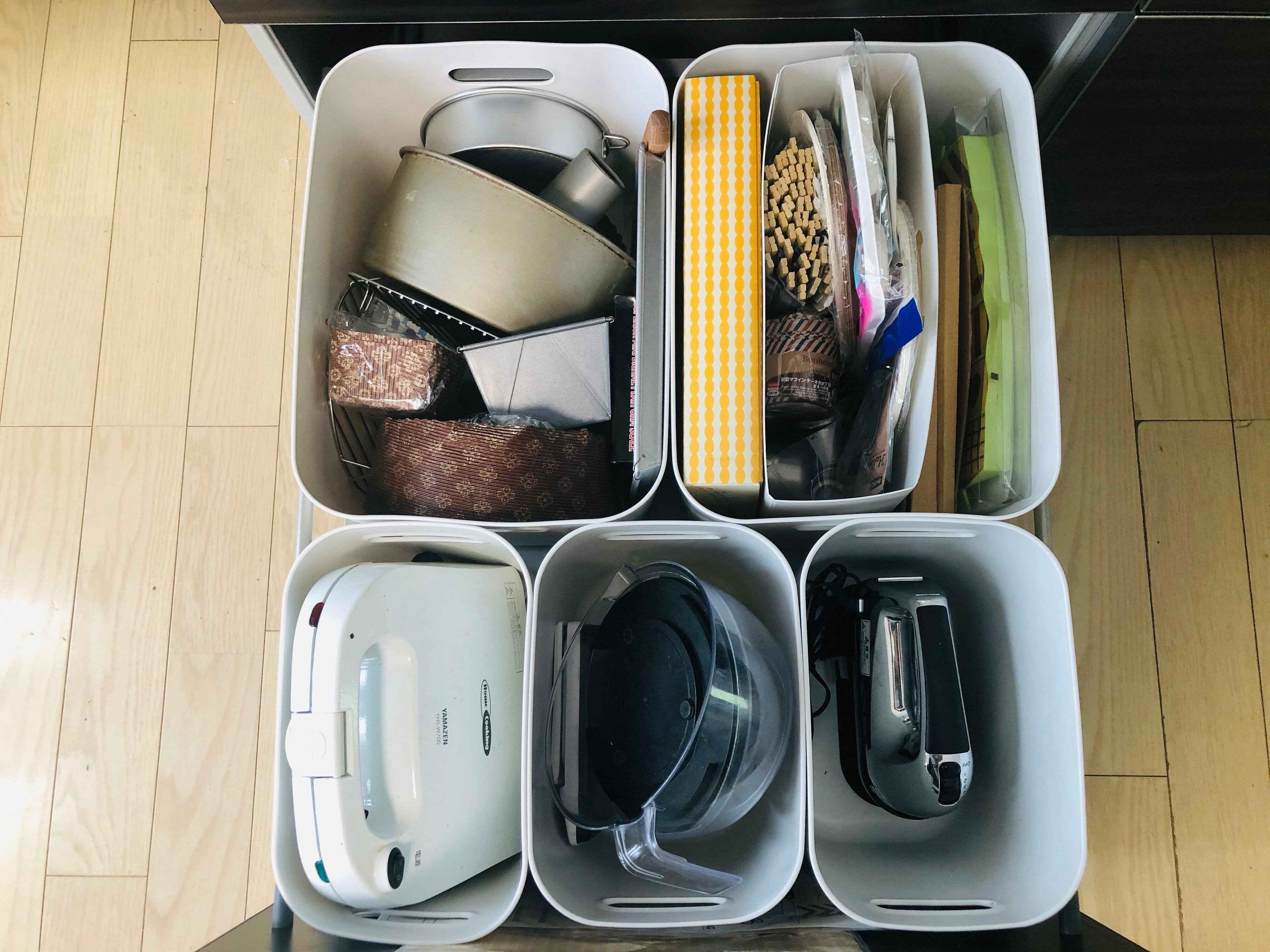 お菓子づくりの道具や紙皿や割りばしなどのパーティーグッズなどの管理にも便利。また、よく使うホットサンドメーカーやハンドミキサーなどを付属パーツとまとめて収納できるのもうれしいところ。