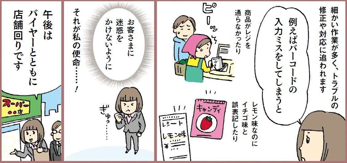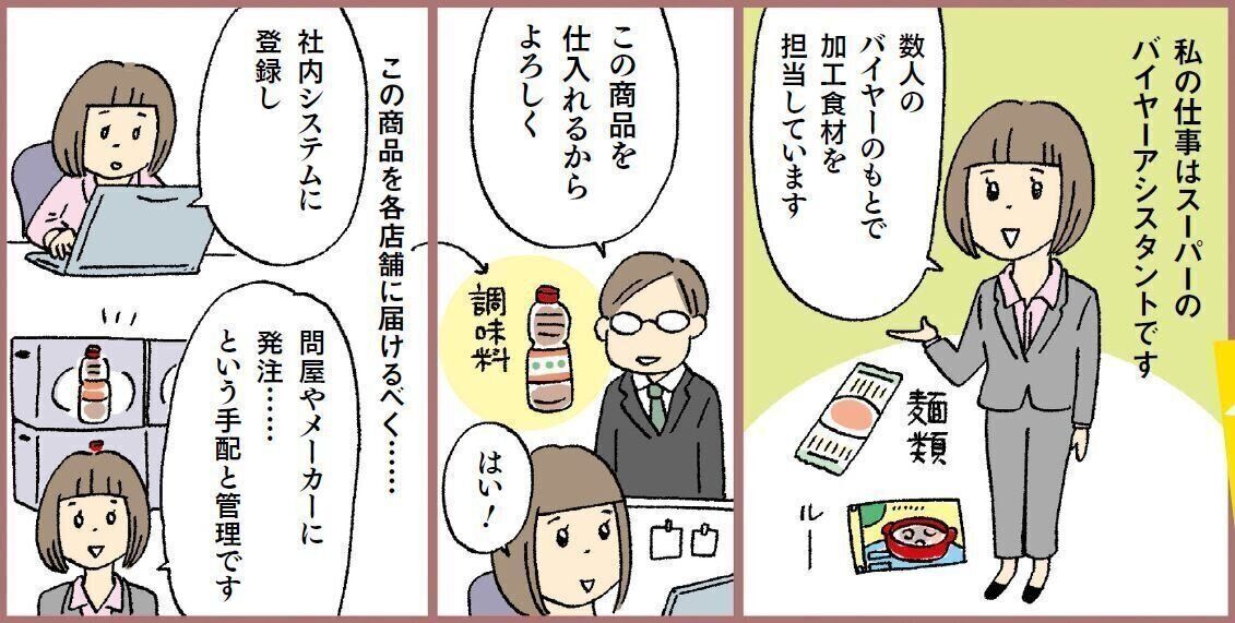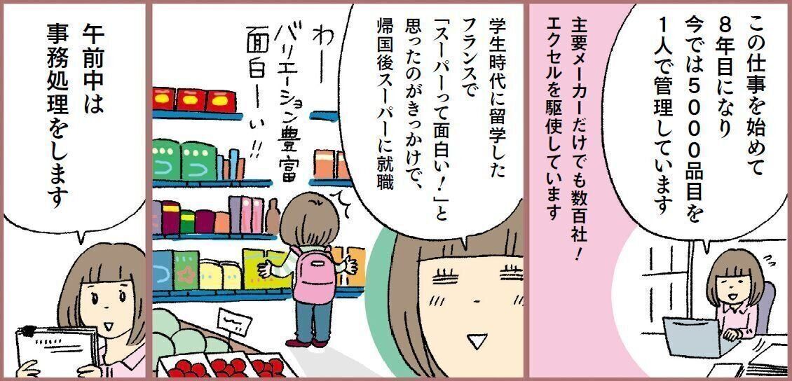 23歳で大学院を中退してスーパーマーケットに就職。1年目は店舗業務を経験し、2年目から本社でバイヤーのアシスタント業務を担当。27歳で結婚し、長男を出産。30歳で離婚してシングルマザーに。週5日、9~18時の勤務に加え、週3~4時間ほど残業している