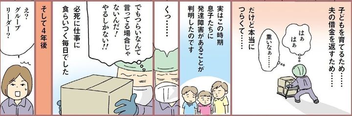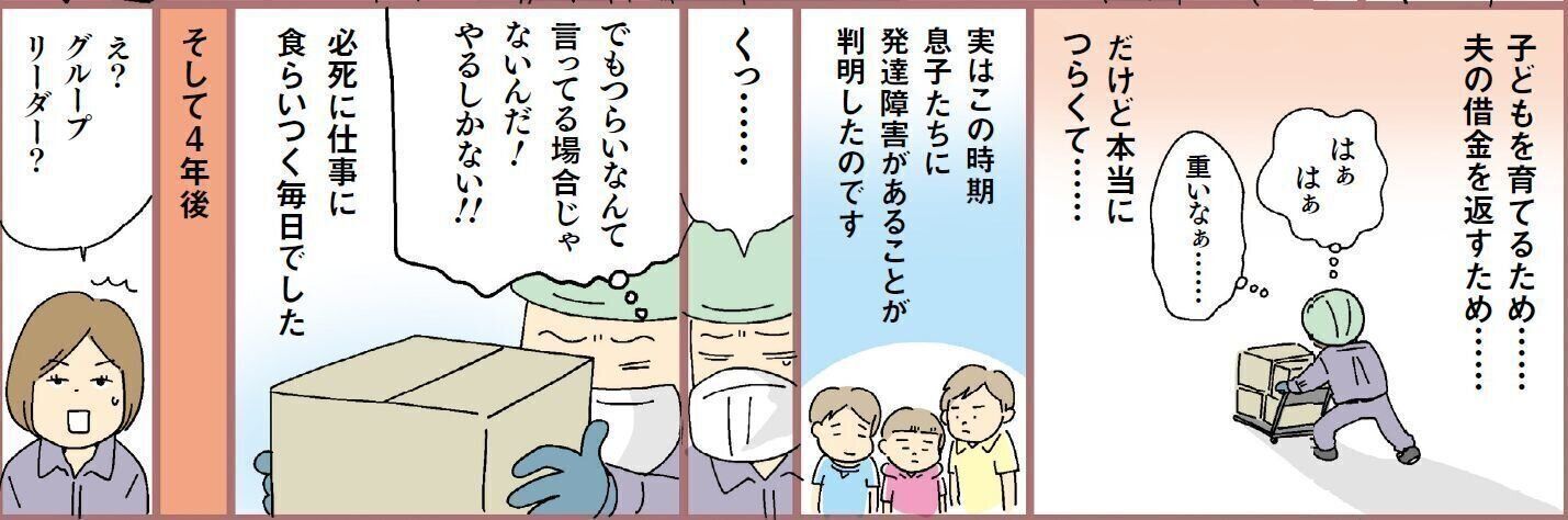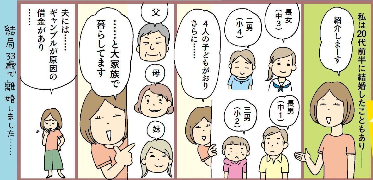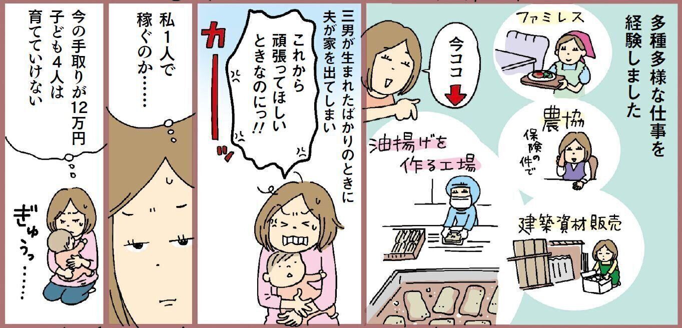 高校卒業後、音楽関係の専門学校に進み、ファミレスに就職。21歳で結婚。さまざまな職場で働きながら22歳で長女、24歳で長男、27歳で二男、29歳で三男を出産。30歳で今の仕事に就き、平日5日8~17時で働く。33歳で離婚が成立してシングルマザーに