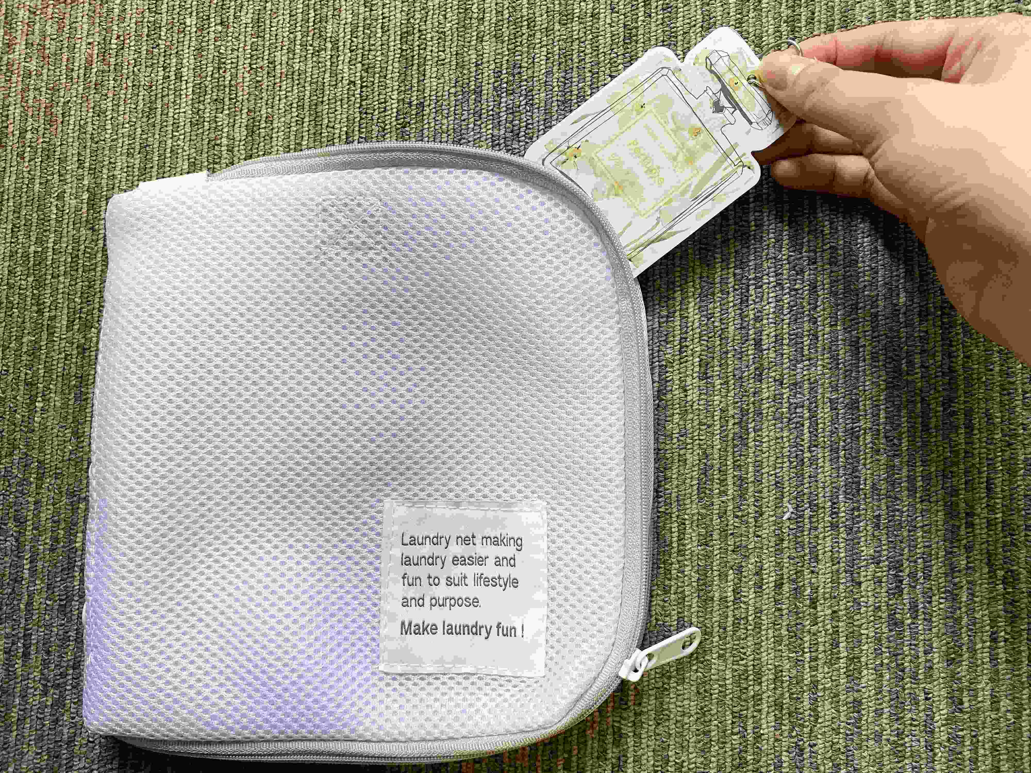 サイズは横6cm×縦9cmと手のひらに乗るくらい。シルバーの紐がついているので、ハンガーにかけて使えますが薄くて小さいからいろいろなところに使えます。