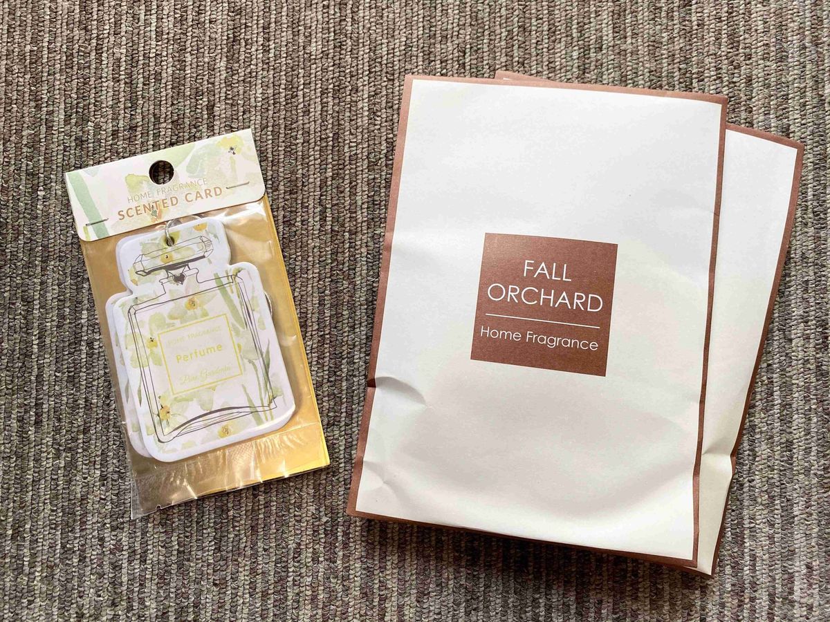 横13cm×縦21cmのサイズで、重量は約50gくらい。なかに「バーミキュライト」という香りつけされた土のようなものが入っています。香りの持続は表示によれば4週間。筆者がリピ買いしている「フォールオーチャード」は紅葉の並木道をイメージした香りだそうです。このほかにも複数の香りがあるので、ぜひ好みのものを見つけてくださいね。