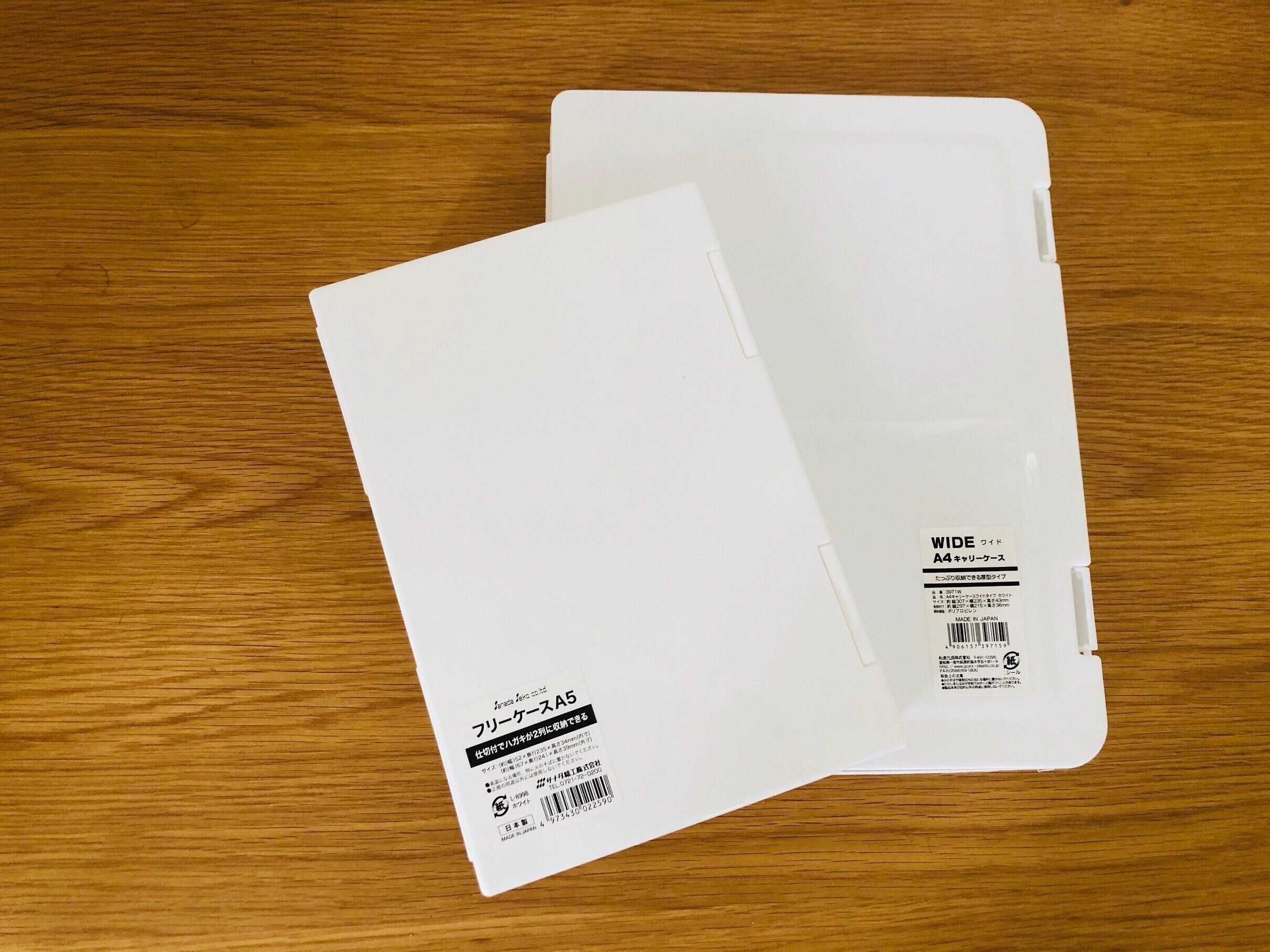今回ご紹介するのは、セリアの白いブック形ケース2種類。A4書類も入る「WIDE A4キャリーケース」のサイズは縦307mm×横235mm×高さ43mm。「フリーケースA5」はA4の半分サイズで、縦241mm×横167mm×高さ39mmとなっています。