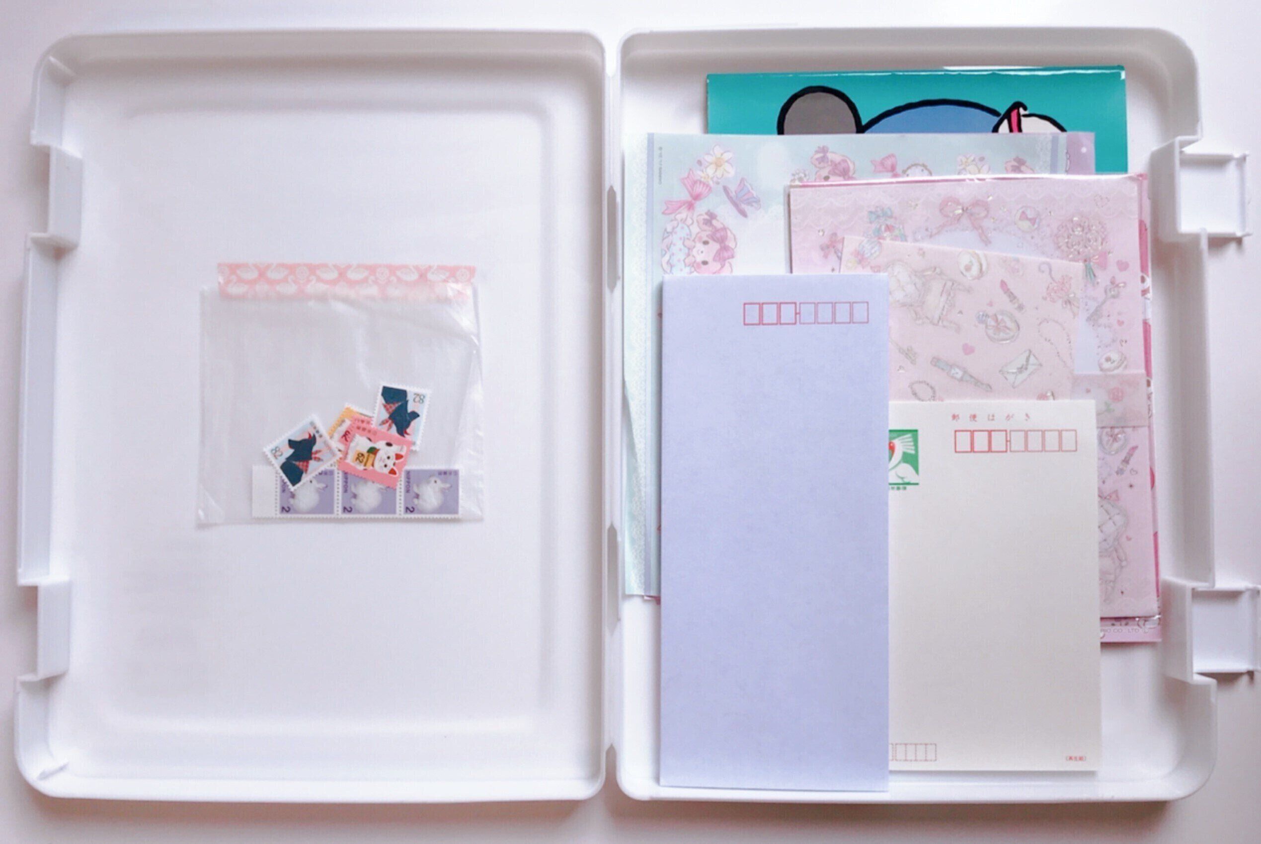 また、お手紙セットとして、便せん、封筒、葉書など纏めて収納。ふたのほうに切手も収納しているので、このまま机に持っていき、お手紙を書いて、切手も貼れば、すぐに投函できます。ペンや、消しゴムなども一緒に入れても便利!