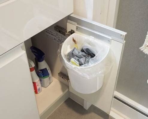 大人気の「ファインBOX 壁かけ用」は、壁に引っかけてゴミ箱として使うことができます。掃除機をかけるときも邪魔にならずとっても便利。こちらは、この「ファインBOX」を洗面台の下、扉の内側に取りつけたアイデアです。捨てるときもラクラク、扉を閉めればすっきり。壁に設置する部分がフラットになっているからこそできる収納技ですね。