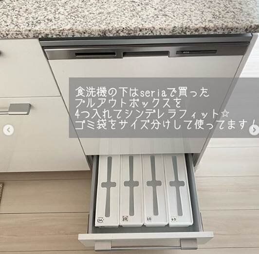 食洗機の下の小さなサイズの引き出しが使いづらいという声をよく聞きます。実は、プルアウトボックスがシンデレラフィットするんです!種類の多いゴミ袋を分別するのにぴったり。プルアウトボックスだから、ゴミ袋もさっと引っ張って取れる!これは真似したくなるアイデアですね。