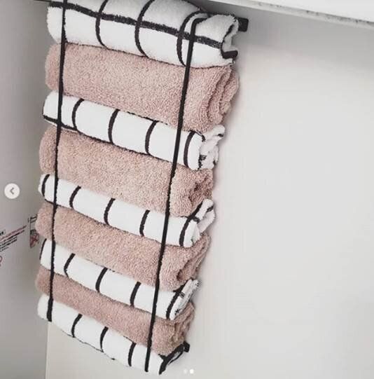 引っかけ収納に便利なアイアンバー。アイアンの風合いがおしゃれでインテリア上級者さんに大人気ですよね。こちらは、アイアンバーをあえて縦向きに使い、タオル収納にしたアイデアです。横からさっと取り出しやすく、洗濯後のタオルの補充もとっても簡単。見た目にもおしゃれで、これは真似したくなるアイデアです!