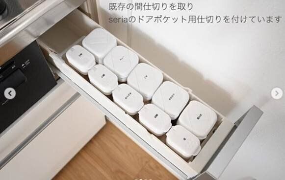 よく使う香辛料をコンロ横のスペースに入れる収納アイデア。容器はすべてセリアの調味料ボトルで統一してあり美しく、使いやすそう!ただ、こういう収納の場合、引き出しの奥まで入れすぎると取りづらいですよね。だからと言って、スペースをあけてしまうと滑って動いてしまう。そこで、同じくセリアの「ドアポケット用仕切り」をいちばん奥に入れて、滑らないように工夫がされているんです。さすがのアイデアですね。