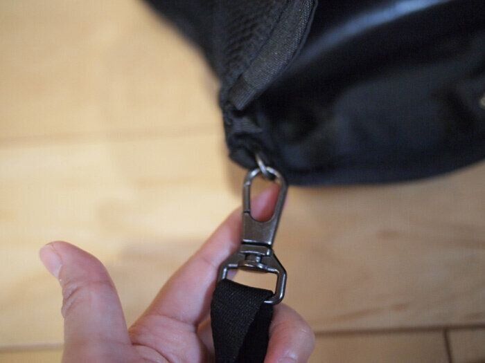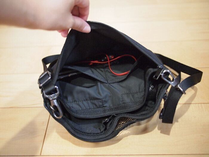 メインのポーチ部分はボタンスナップ式。お財布などすぐに取り出す必要のあるものはこちらですね。あとは先ほどご紹介した手前のメッシュ部分と、後ろ側のポケットが二つついているファスナー部分とに分かれています。いろいろなものを持ち運ぶ想定をしてあり、便利です。
