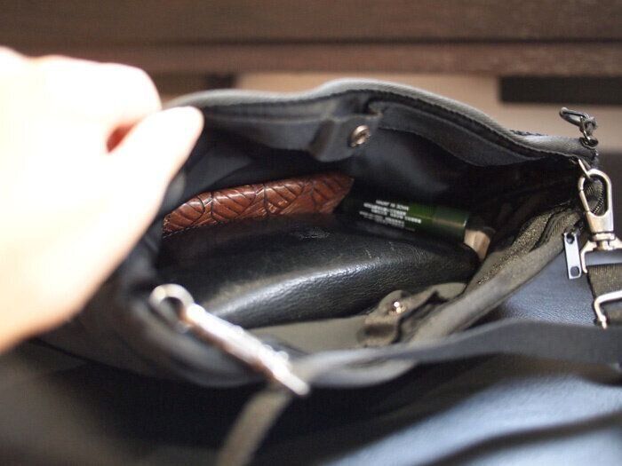 名刺入れとかはサッと取り出したいので、ポケット部分に入れておくと分別がついて大変便利です。あとは、リップクリームとかもポケット部分に入れておくと便利。先ほど紹介した大きなボタンスナップの箇所は日焼け止めぐらいの厚さのものなら入るので、自前のエコバッグがないときも多少融通がききますよ。