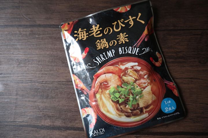カルディの「海老のびすく鍋の素」1人前×2袋195円。1人前約98円です。毎年、寒くなると登場する鍋の素です。