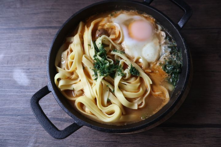 おすすめの〆は、鍋を火にかけて茹でたフィットチーネを加え、卵を加えてひと煮立ちさせたら完成です。フィットチーネに半熟の卵と濃厚なスープが絡んで絶品です。