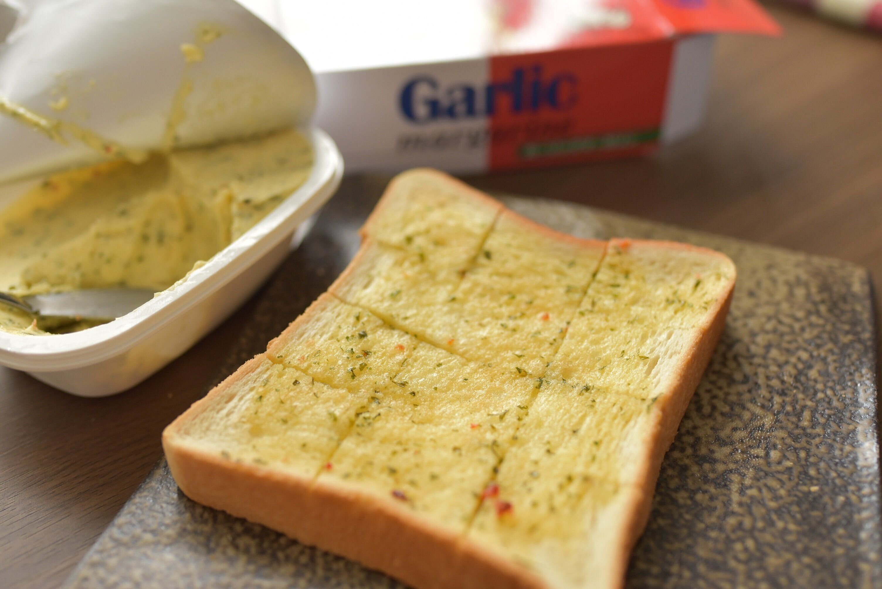 パンに塗ってガーリックトーストとして食べる場合、マーガリンを塗る前にパンの表面が少し硬くなるくらいまでトーストしましょう。そこにマーガリンを塗り、再度トーストすることで、マーガリンがパンに染み込み、香りも広がります。ほんのり焼き色がついたら完成です。