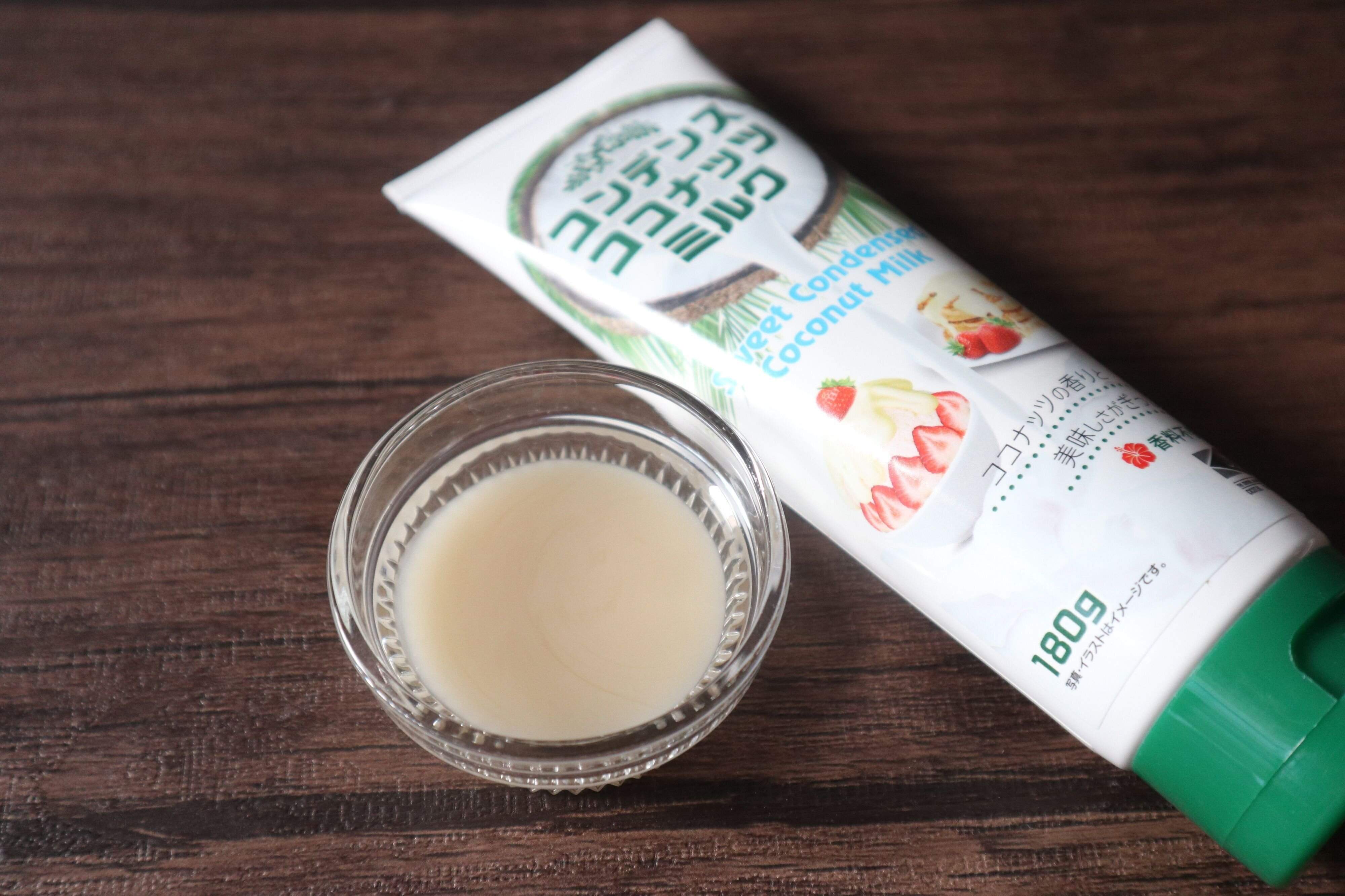 コンデンスミルクは牛乳と砂糖を煮詰めてつくられていますが、この「コンデンスココナッツミルク」はココナッツミルクと砂糖を煮詰めてクリーム状にしています。