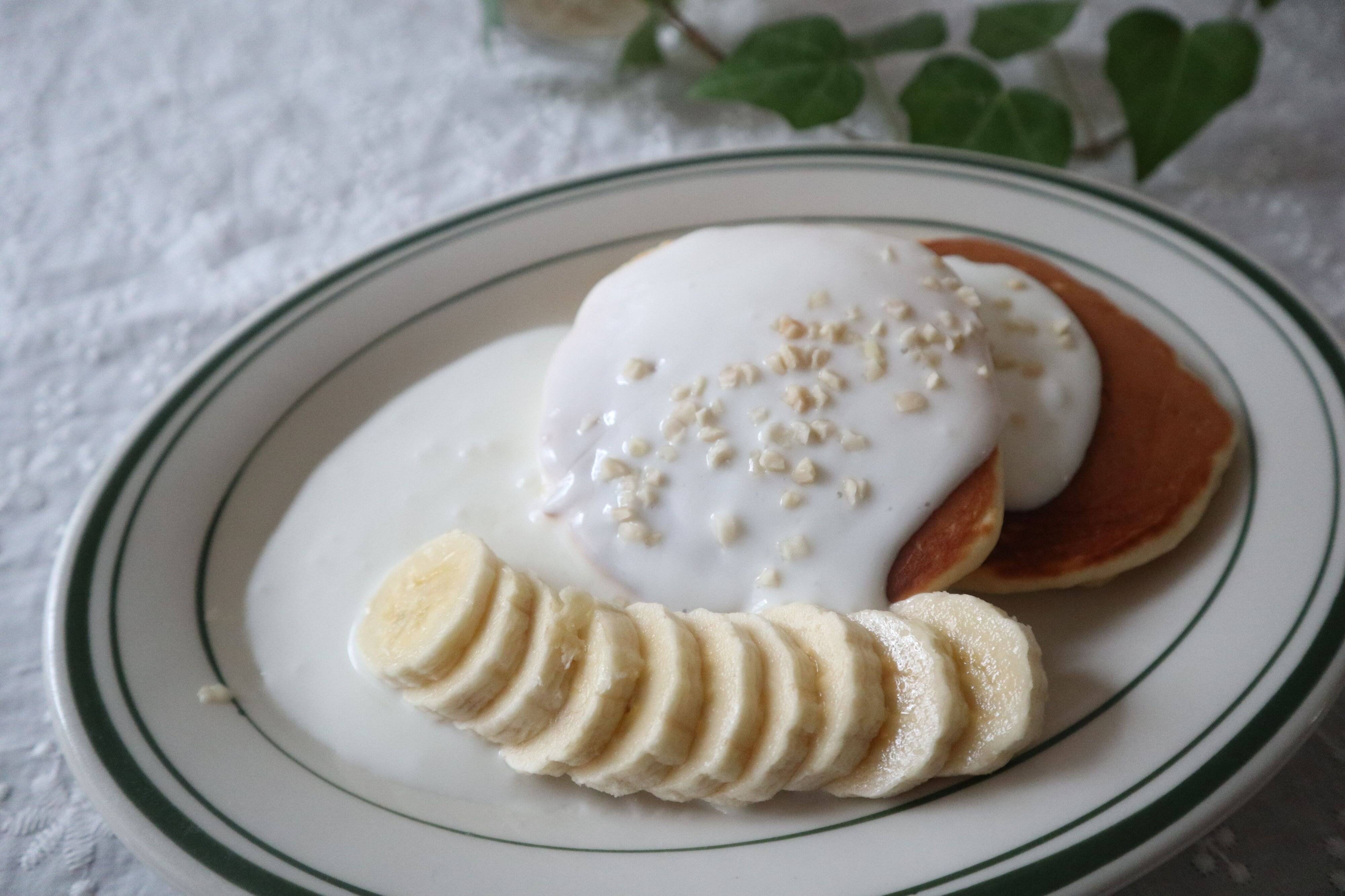 ヨーグルトにコンデンスココナッツミルクをたしてソースします。ヨーグルト大さじ3と、コンデンスココナッツミルク大さじ1で1人分です。パンケーキにかけて食べるとココナッツが香って、ハワイアンパンケーキのような雰囲気に。