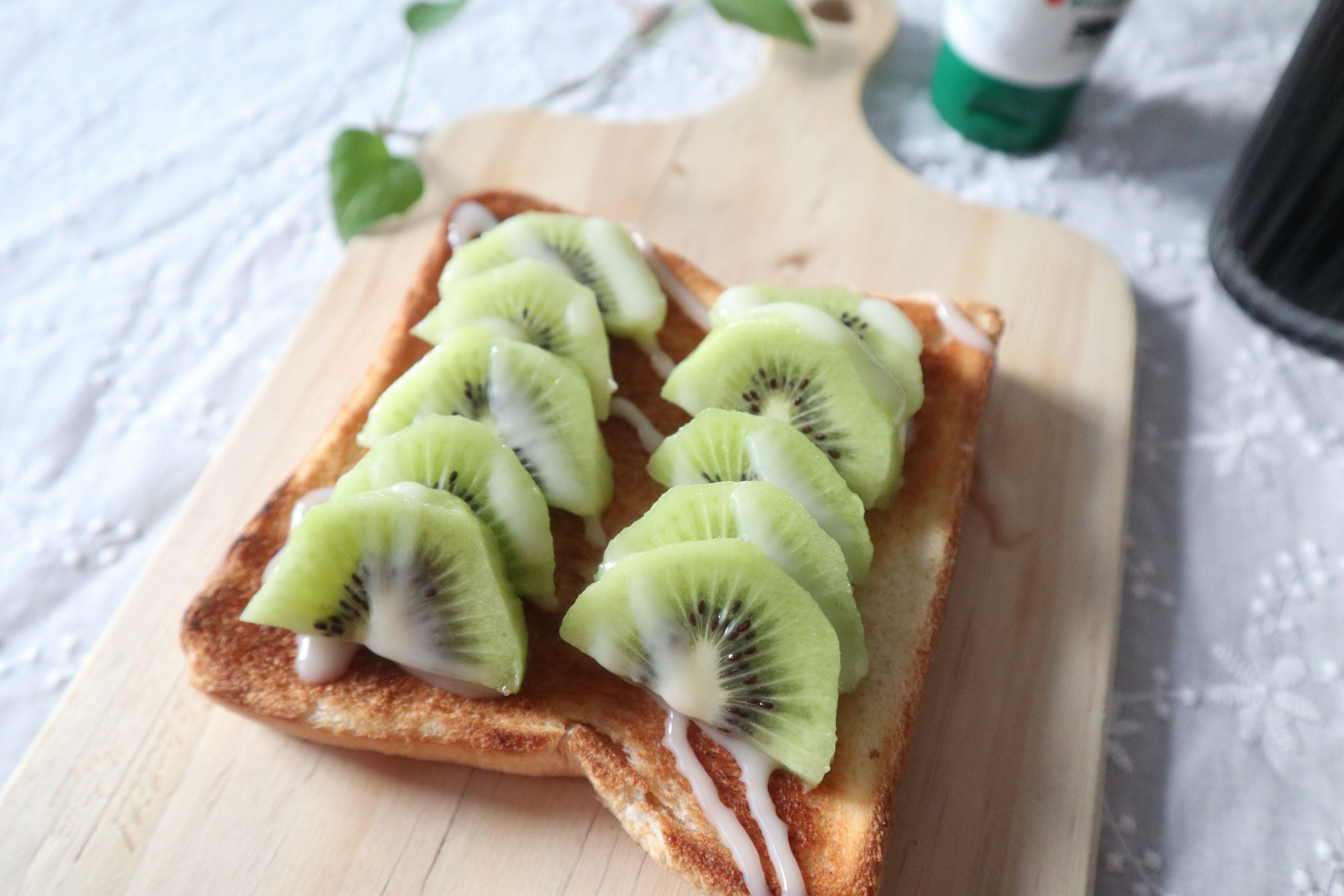 まずは、トーストアレンジに!トーストした食パンの上にお好みの果物(キウイ、バナナ、イチゴ、オレンジなど…)をのせて、コンデンスココナッツミルクをお好みの量かけます。