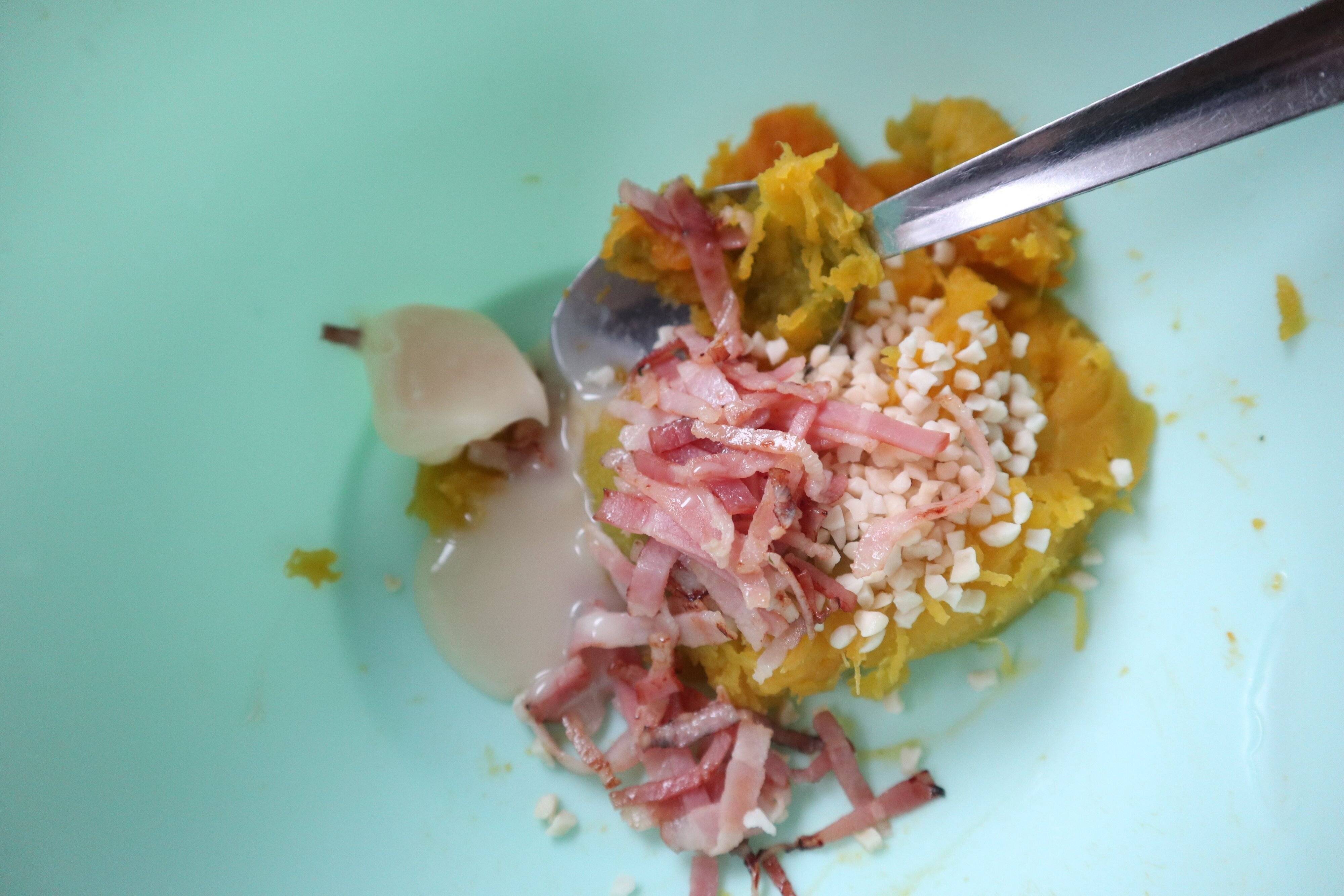1.かぼちゃは種を取り、ラップに包んで600Wの電子レンジで6分加熱。粗熱が取れたら、スプーンで皮をはがします。ベーコンは細切りにしてフライパンでさっと炒める。