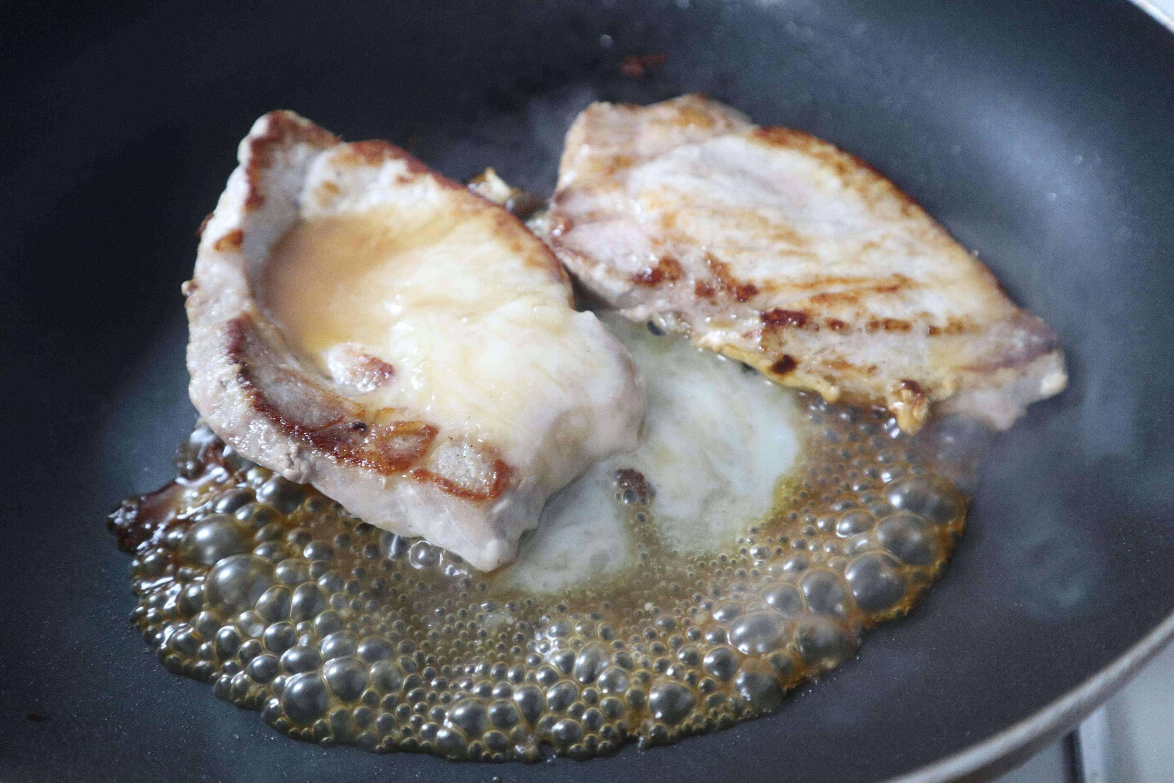 1.豚肩ロースに塩コショーをふり、フライパンを中火にかけて両面こんがり焼きます(テフロン加工の場合は油は引かなくてOK)。