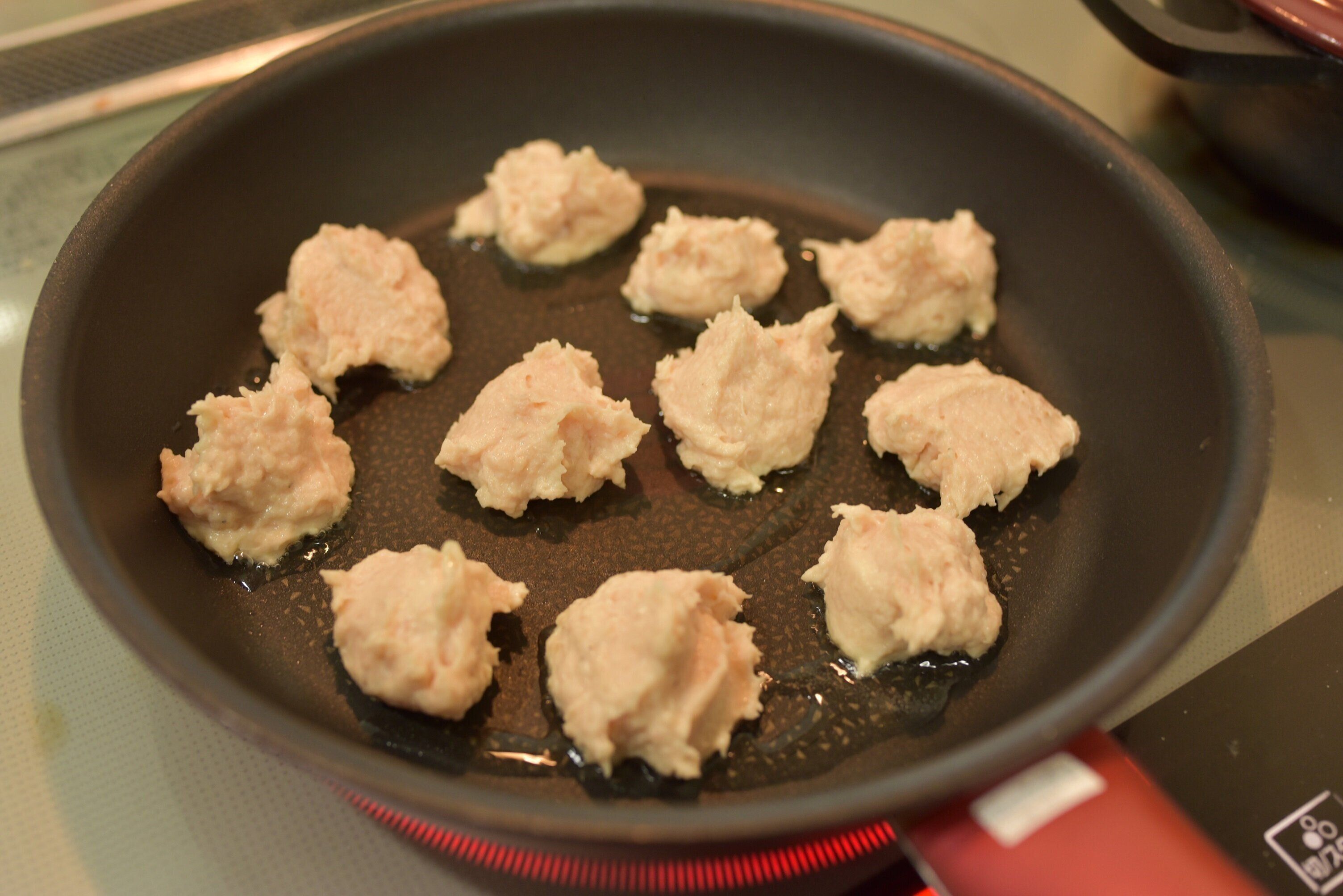 3.肉だねをスプーンですくって、油をひいたフライパンにのせます(フライパンは冷たいままでOK。のせ終わってから火をつけます)。