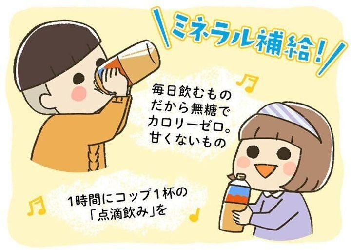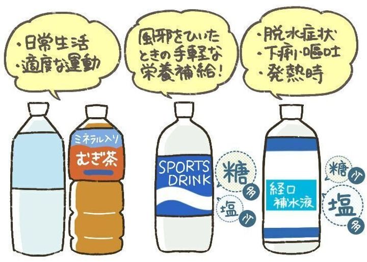 食事のときやカラダを動かしたあと、寝起き&就寝前など、毎日の生活の中では「ミネラル入りむぎ茶」がおすすめ。風邪をひいたときの手軽な栄養補給には「スポーツドリンク」を。下痢・嘔吐(おうと)・発熱時など脱水症状を伴うときは、医師の指示のもと「経口補水液」を飲むなど、生活シーンや体調に合わせて選びましょう。