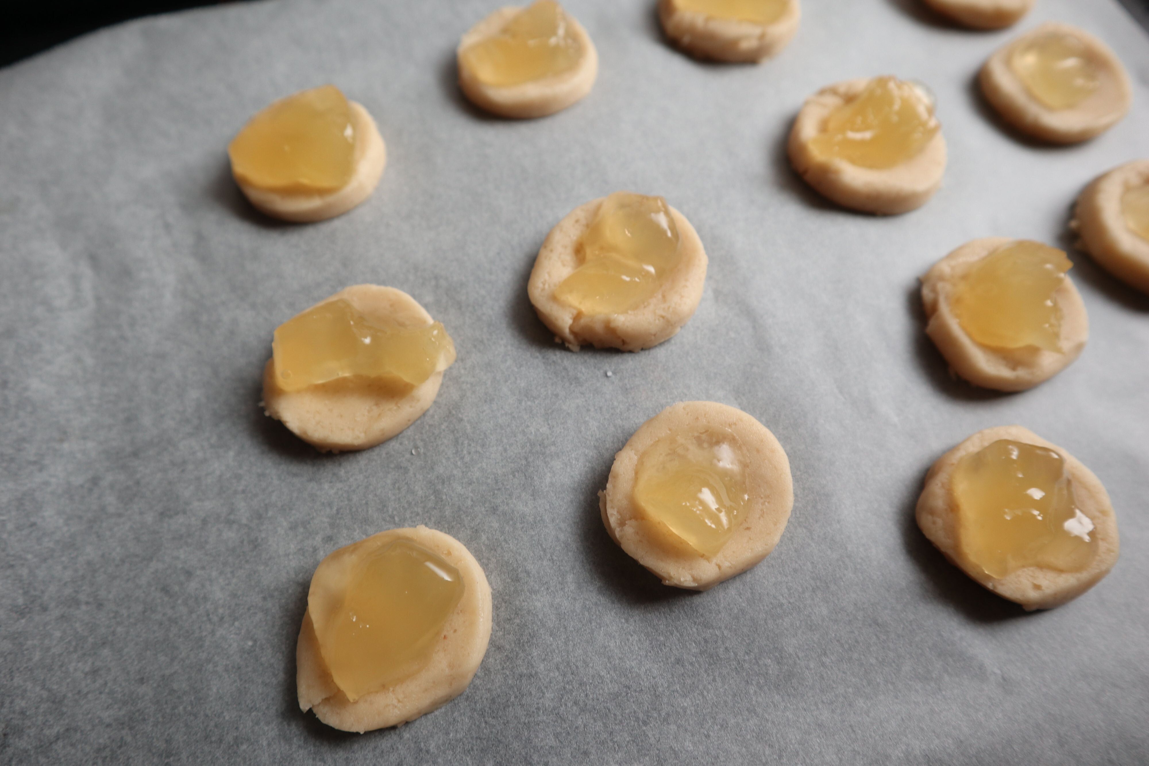 今回は、切り分けたクッキー生地の中心を指で軽く押さえてくぼませ、そこにジャムをのせました。簡単なアレンジです。