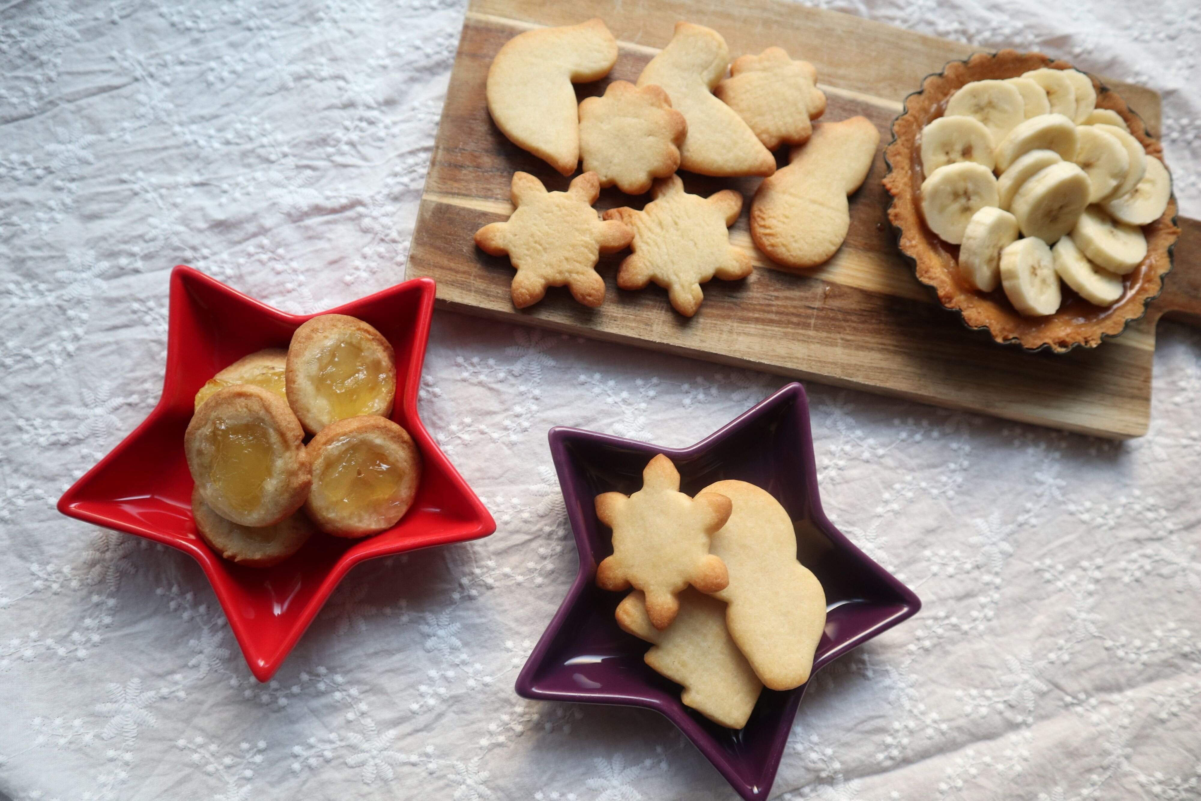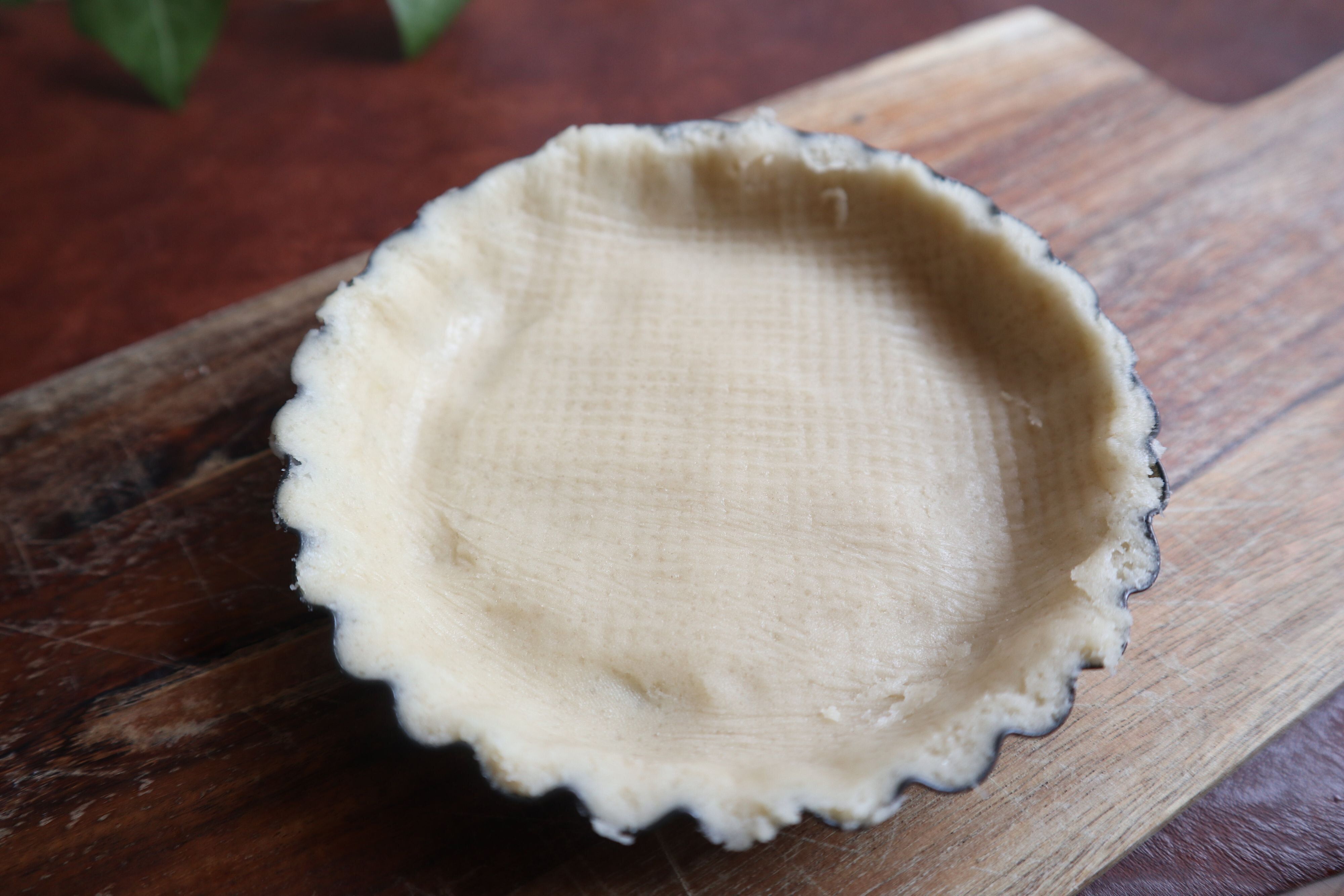 油脂を塗ったタルト型に、綿棒で伸ばしたクッキー生地を敷いて焼けばOKです。