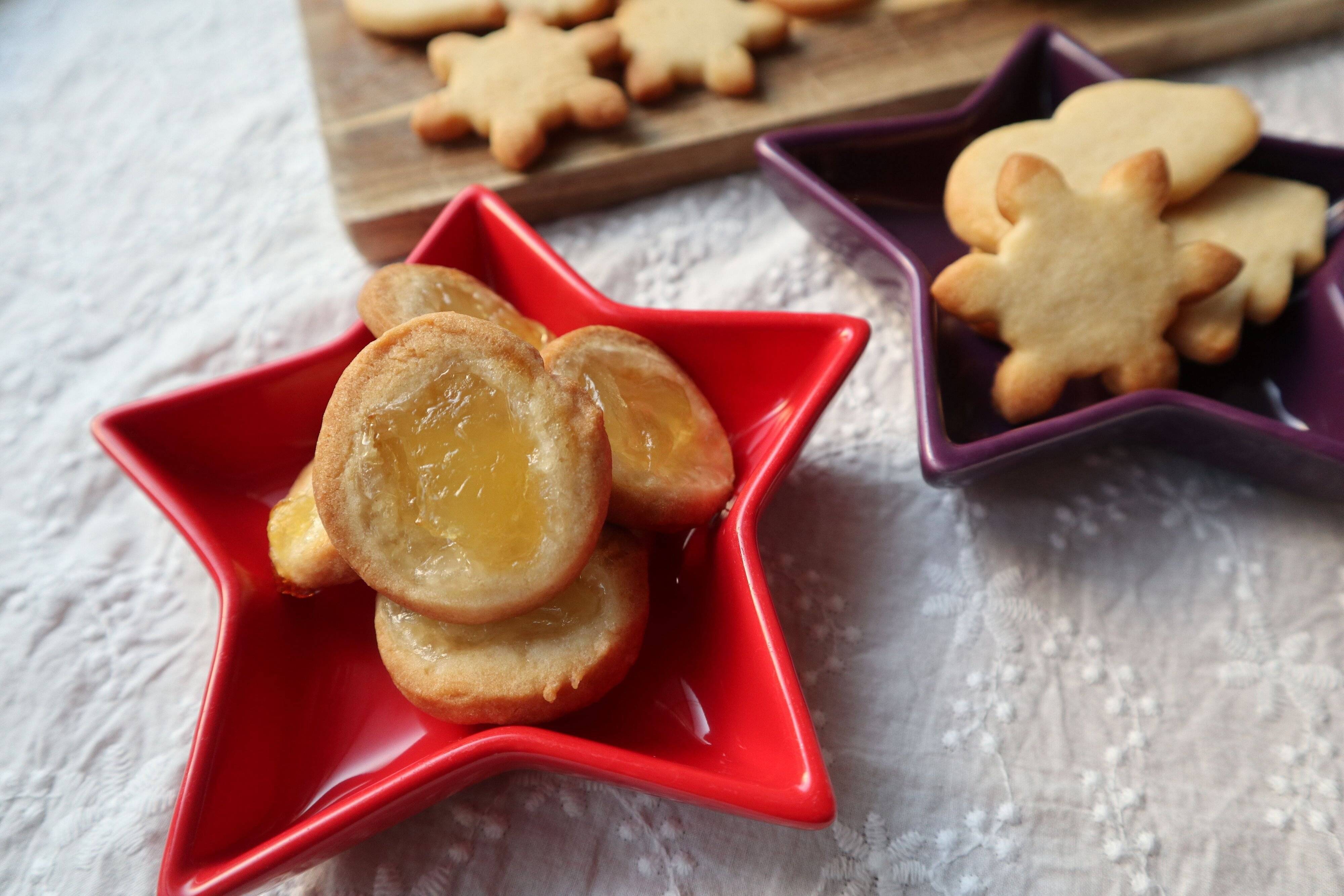 甘酸っぱいジャムのクッキーが完成。生地はバターがたっぷり入っているので、甘酸っぱさと合わせるとちょうどいいです。今回は、リンゴのジャムを使っていますが、イチゴやブルーベリーなどお好みのジャムでOK!