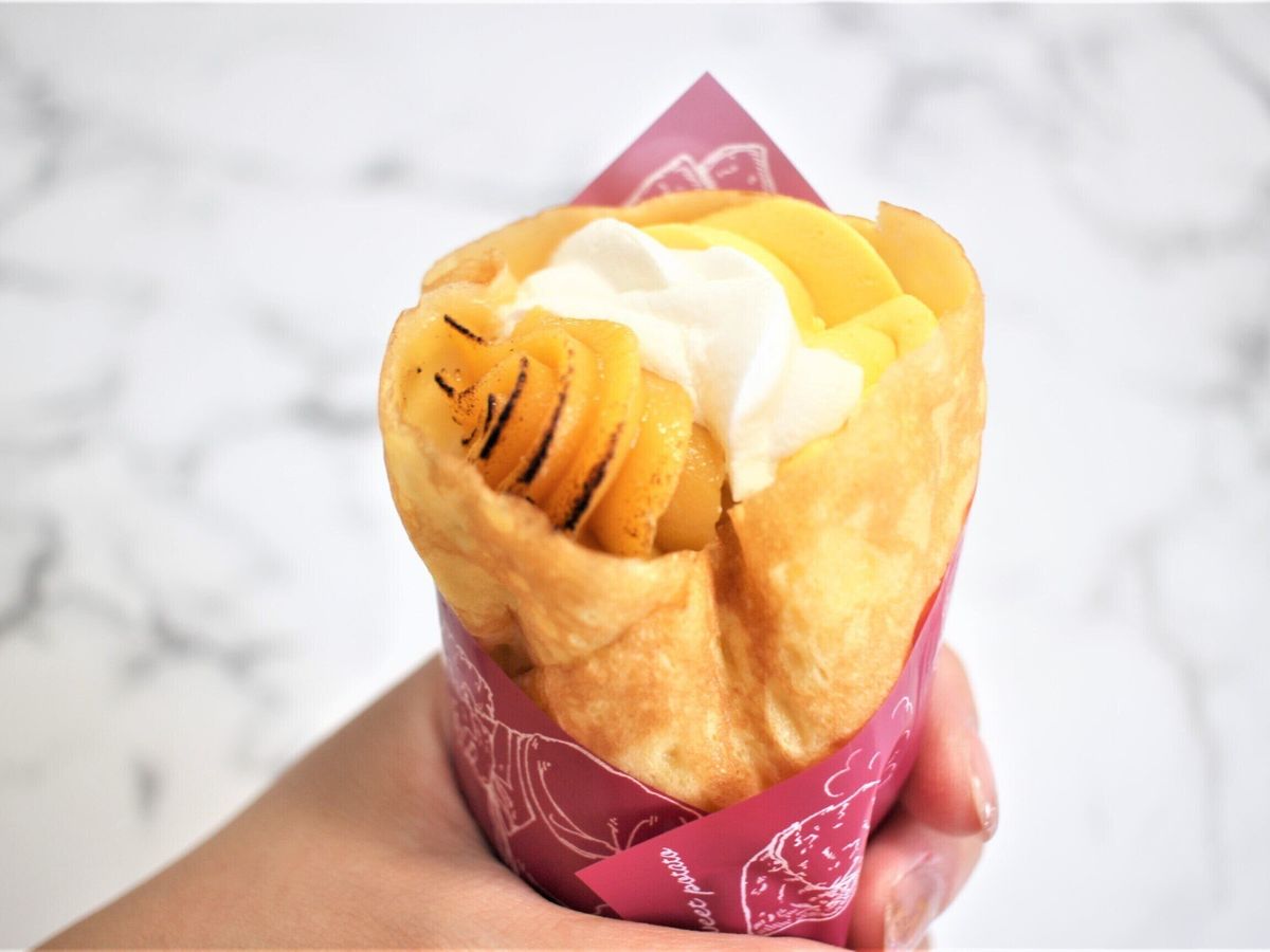 ホイップクリームと安納芋クリームと一緒にもちもちクレープで包まれています。