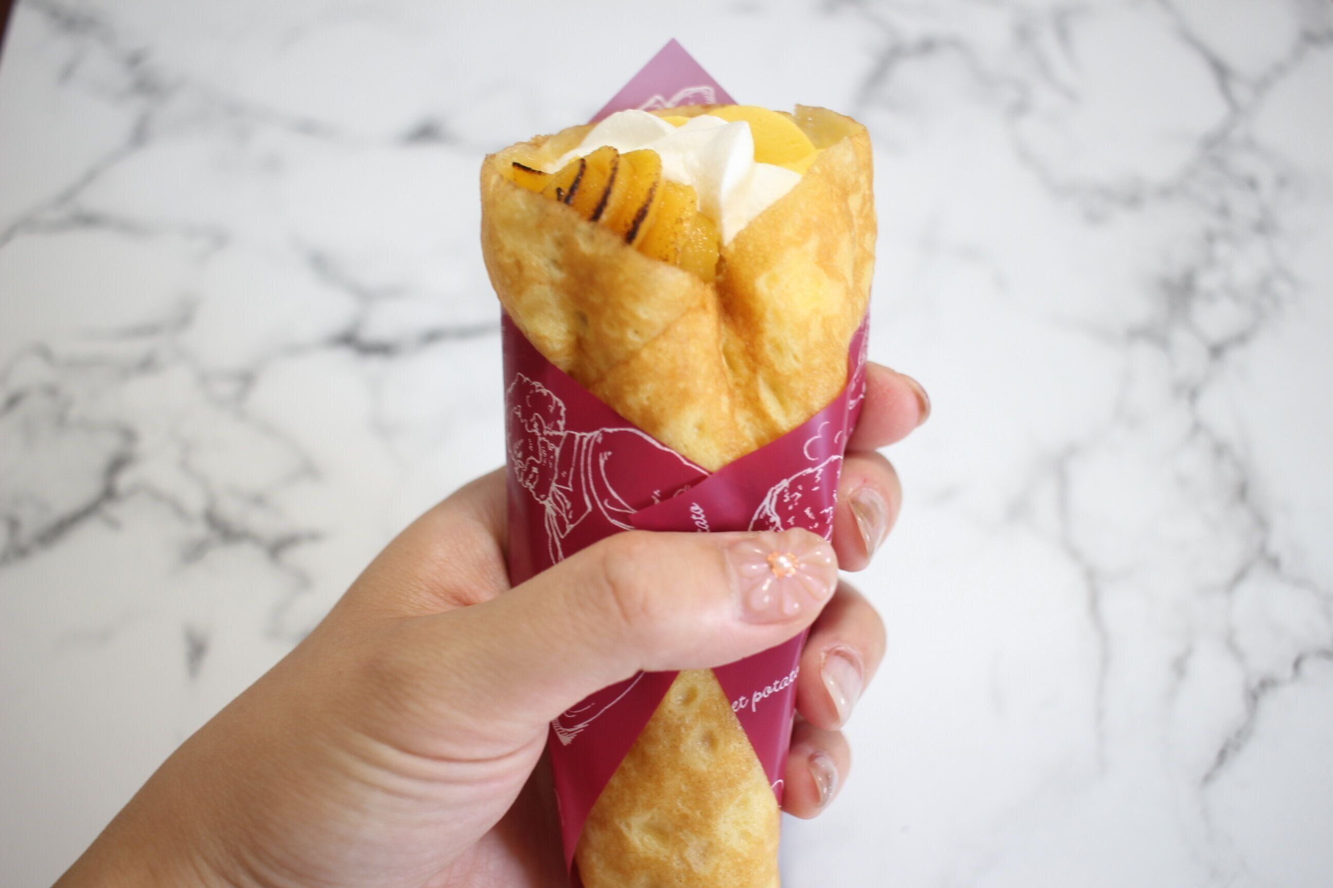 クレープ生地はほんのり甘くておいしい!もちもちっとしてとても柔らかいので、しっかり持たないとフニャンと倒れていくので注意が必要です。