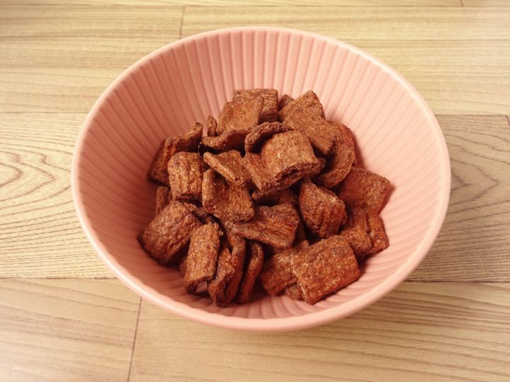 堅さは少し固めで、食感は軽いですが食べ応えがあります。しっかりとした甘さの中にほんのり塩味を感じるシリアルです。そのまま食べても美味しいですが、牛乳などをかけるとチョコレートが溶け出して、食べ終わる頃にチョコミルクになります。