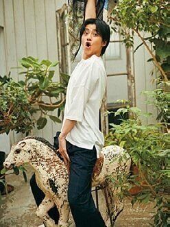 スタジオにあった木馬にまたがり、ポーズを決める飯島さん。変顔すらイケメン!お茶目な一面もあるんです。