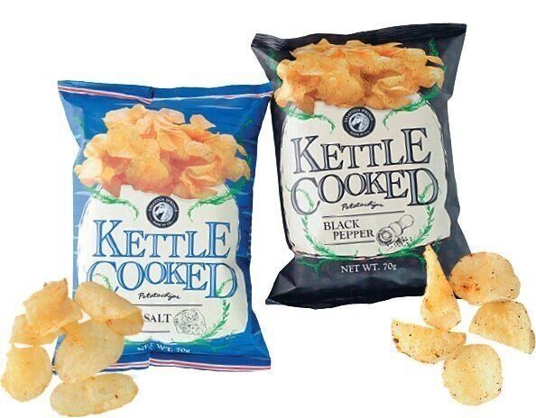 「サラトガスプリング ケトルクックチップス」右/ブラックペッパー、左/ソルト各184円