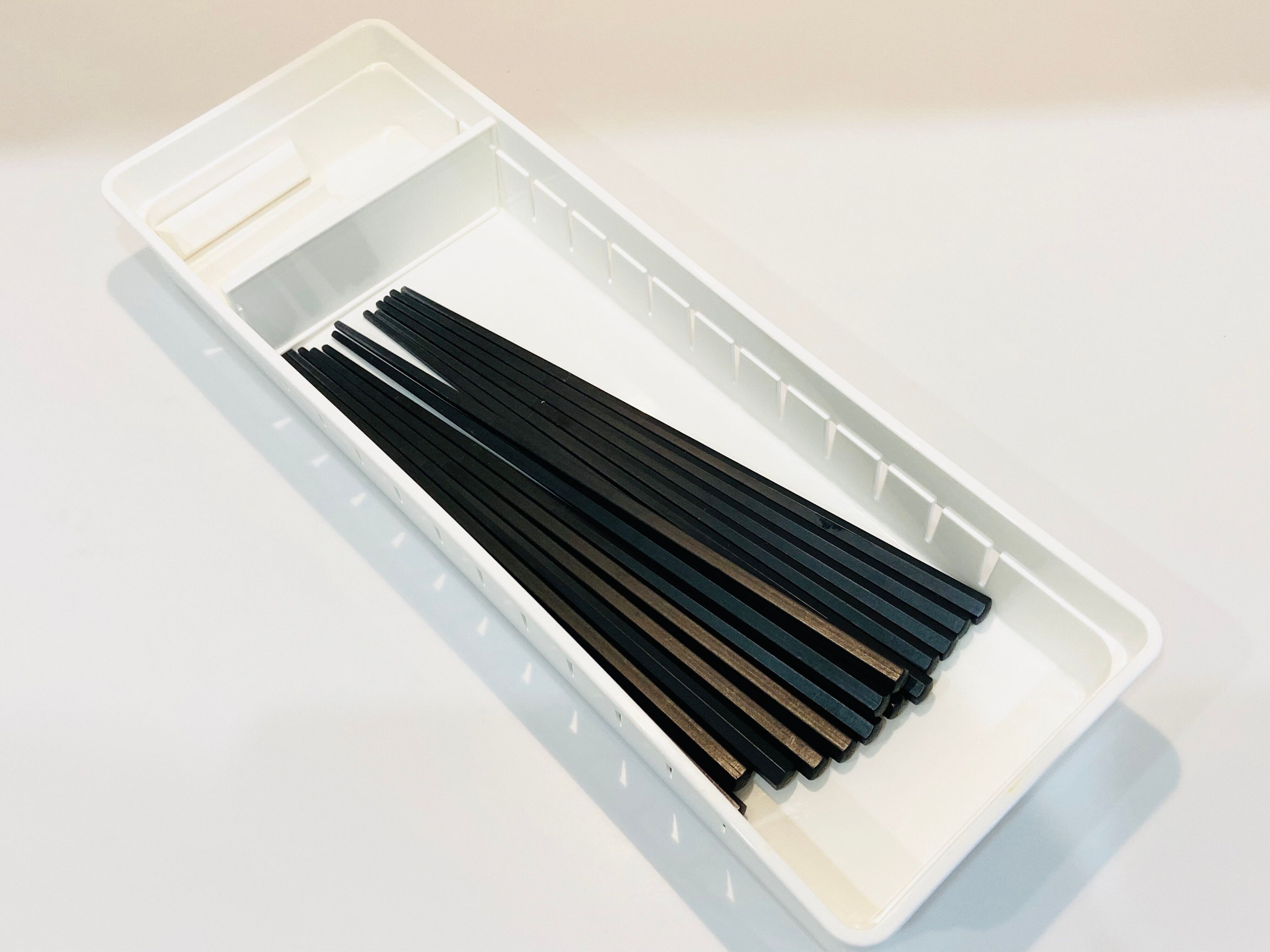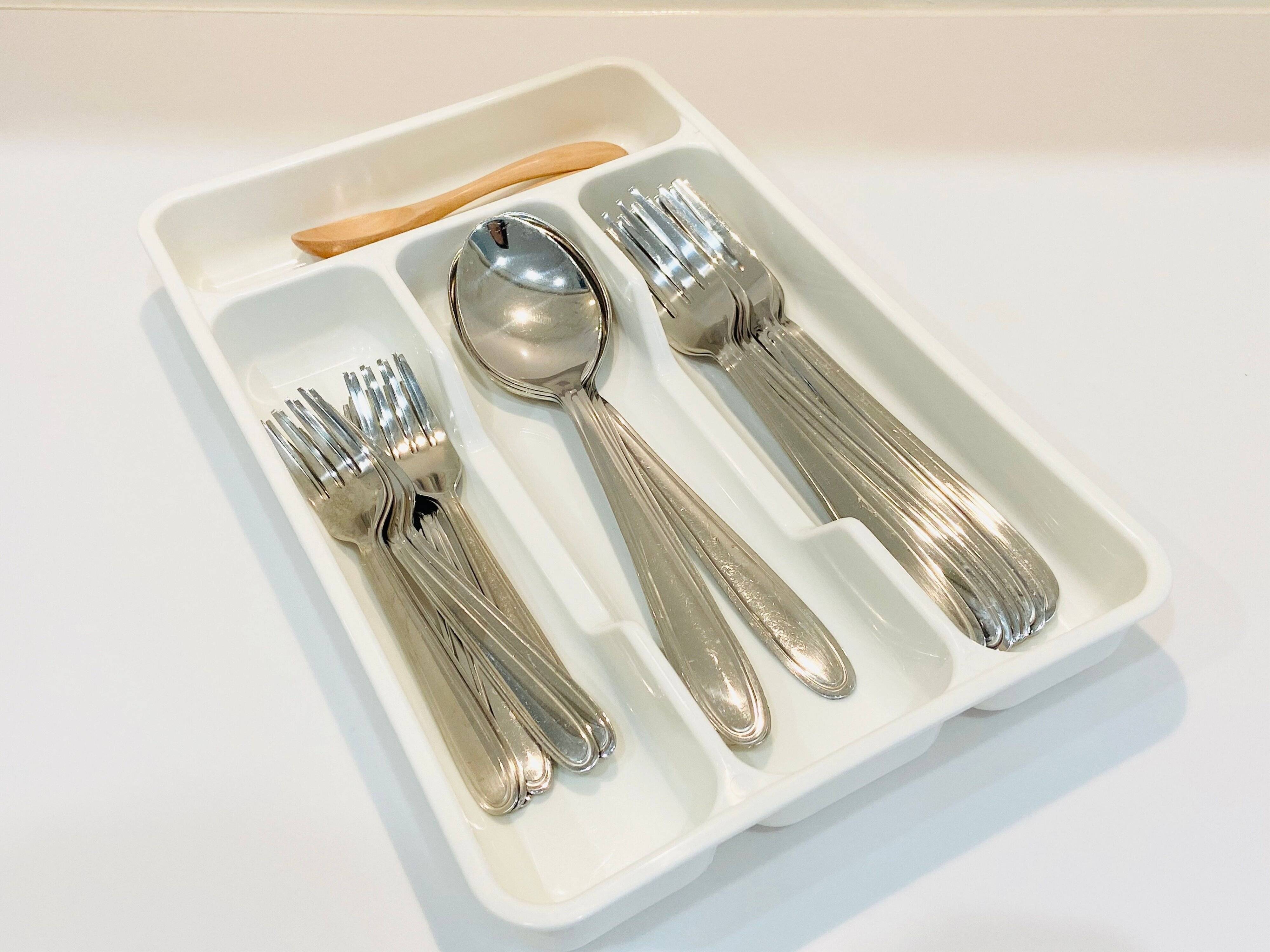 スプーンやフォークを収めるのに仕切りのサイズ感がちょうど良く、1つのトレーで4つの仕切りがあるので使用する物ごとに分けて入れることが可能です。これを使い始めてから、いちいちフォークやスプーンを探すことがなくなって、夫も食器を片付けるときに元の位置に入れてくれるようになりました。