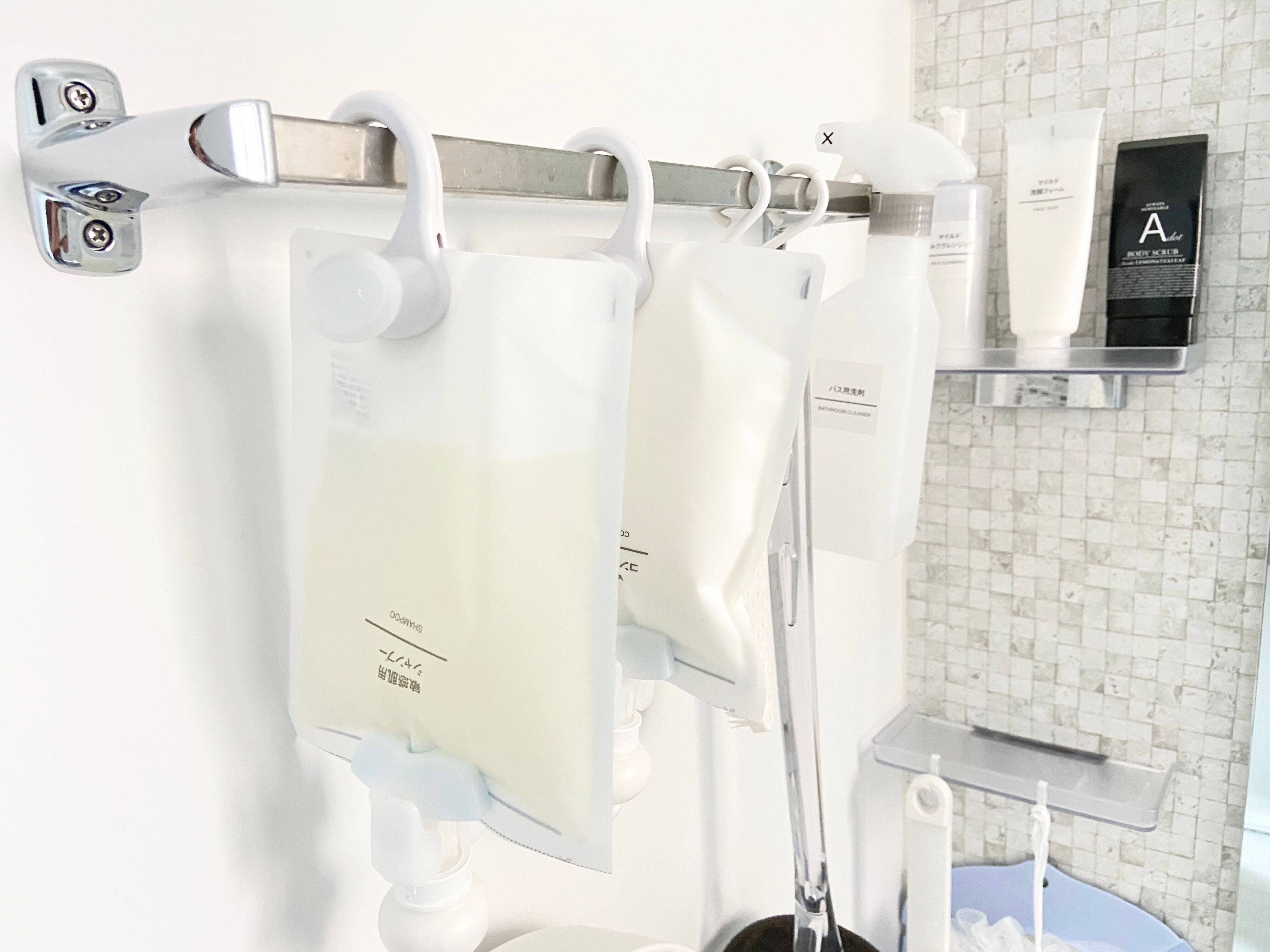 以前はシャンプーやコンディショナーを詰め替えていましたが、手間を省くために、サンキの詰め替えそのままミニに詰め替えレフィルをセットするだけに!浮いているのでヌメリとは無縁で掃除が楽ちんになっただけでなく、詰め替えの手間も省けて、最後まで余すことなく使いきれてとってもエコかつストレスフリーになりました。