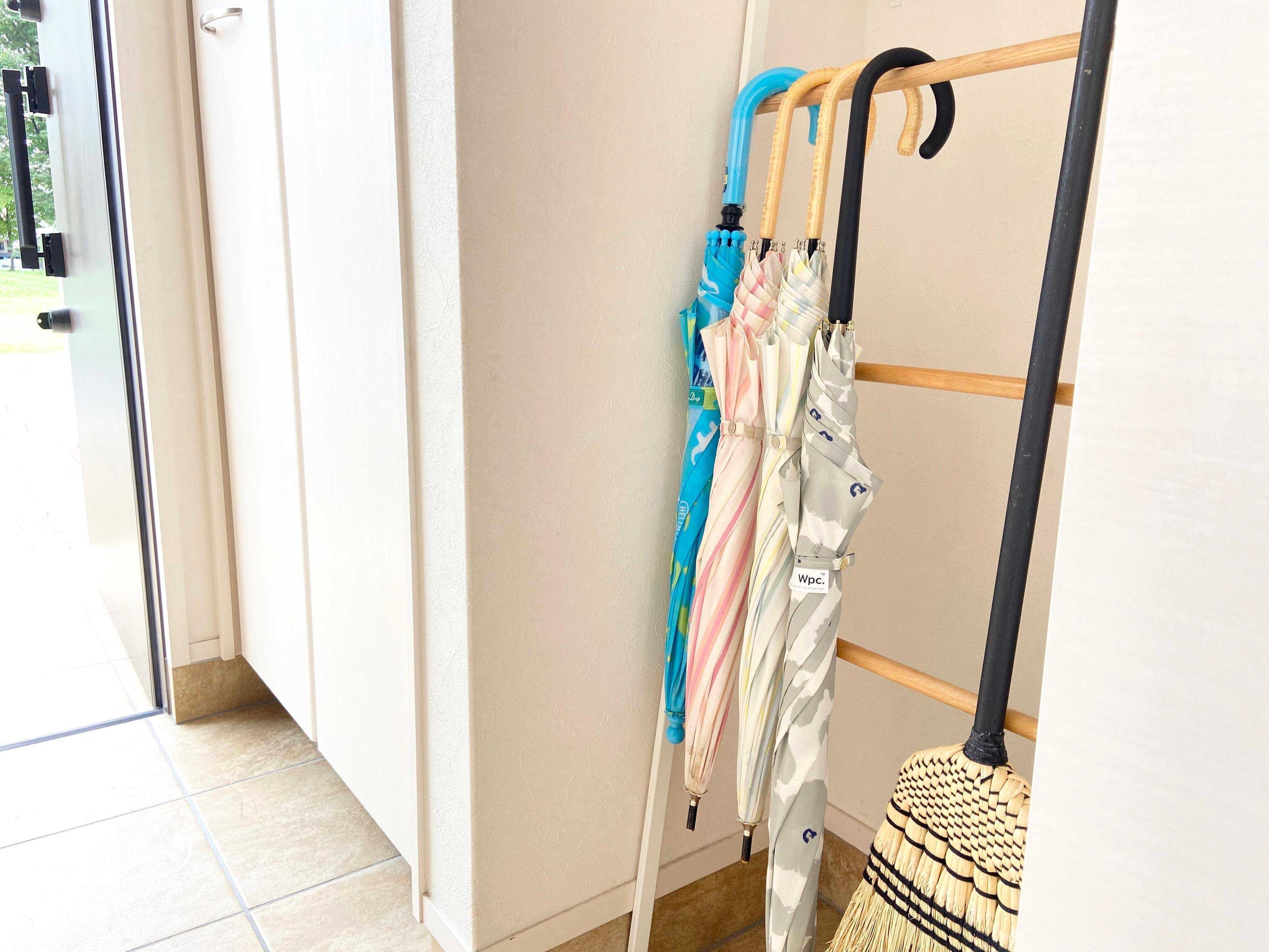 傘の置き場と言えば傘立てと思っていましたが、これもなくしてみたら全く問題のなかったモノの1つです。玄関ラダーに引っかけるだけなので、子どもたちが取り出すのももどすのもとっても簡単で、掃除の邪魔にもなりません。