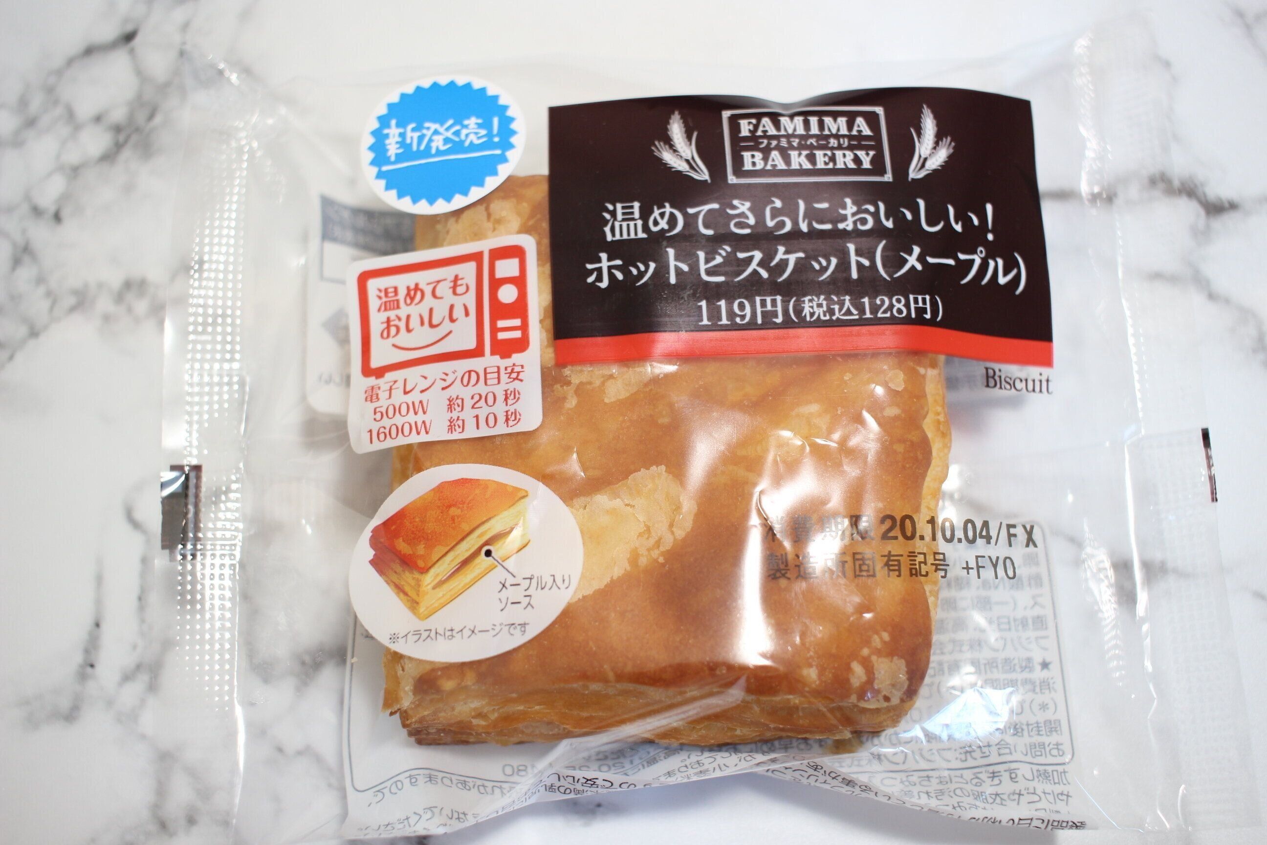 明日の朝ごはんはなににしようかな~とファミマのベーカリーコーナーを見ていると新商品シールが貼られた「温めてさらにおいしい!ホットビスケット(メープル)」を発見。