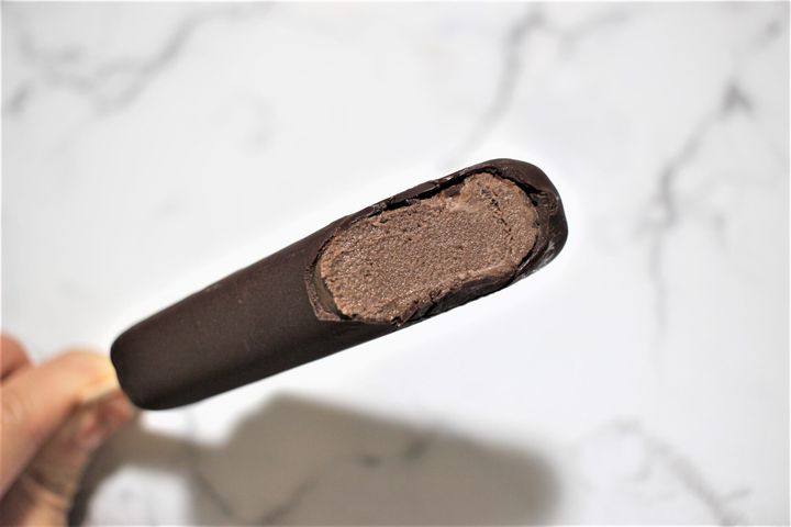 外側のチョココーティングは薄くパリパリっとした食感で、内側はねっとりとしたジェラートのようなアイスチョコレートです。洋酒が入っているので大人な味わいですね。