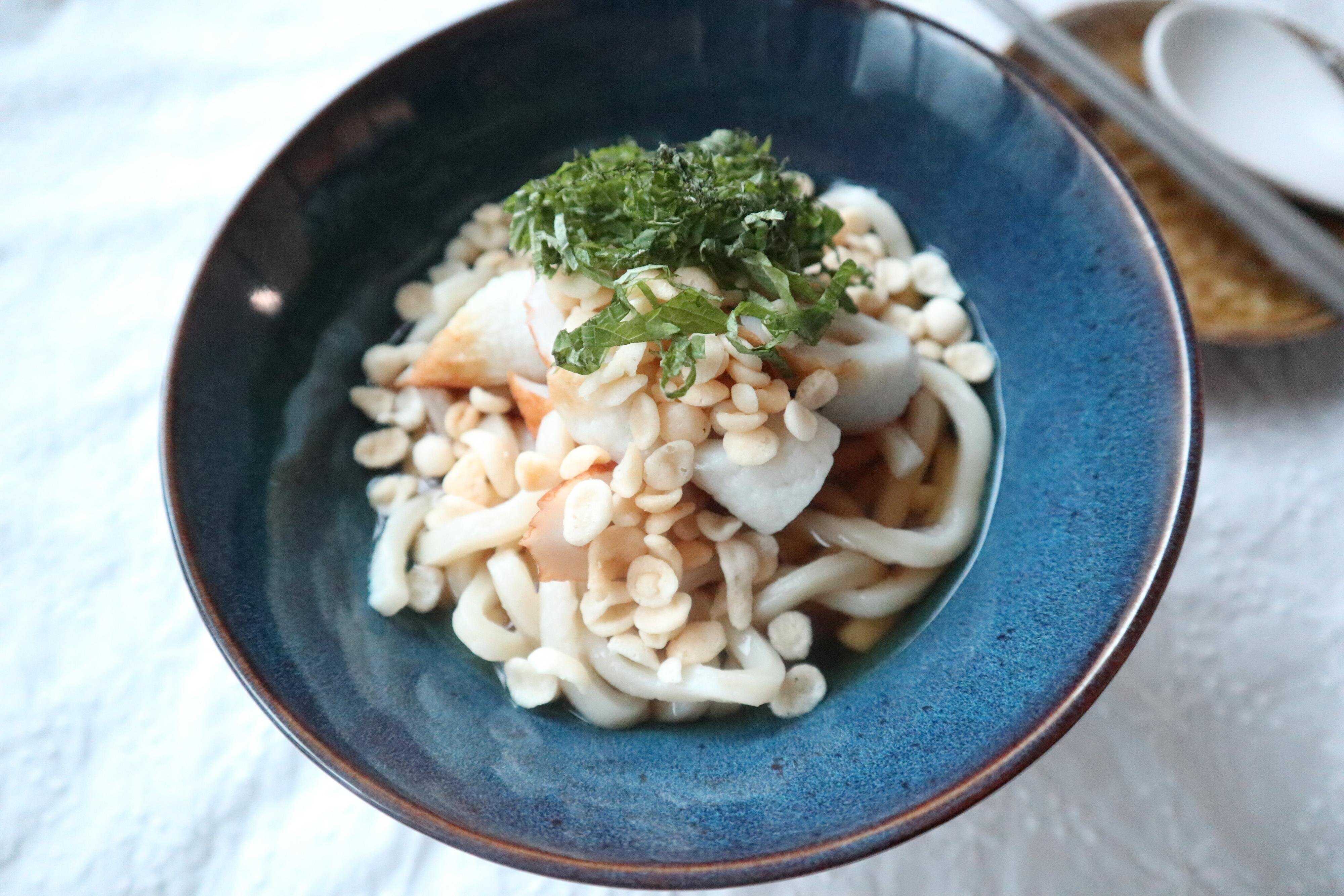 ちくわのトッピングもおすすめです。器に電子レンジで加熱したうどんを入れて、お好みの濃さの麺つゆを加えて、ちくわ、揚げだまをのせたら完成です。あれば大葉を刻んでのせるのもおすすめです。