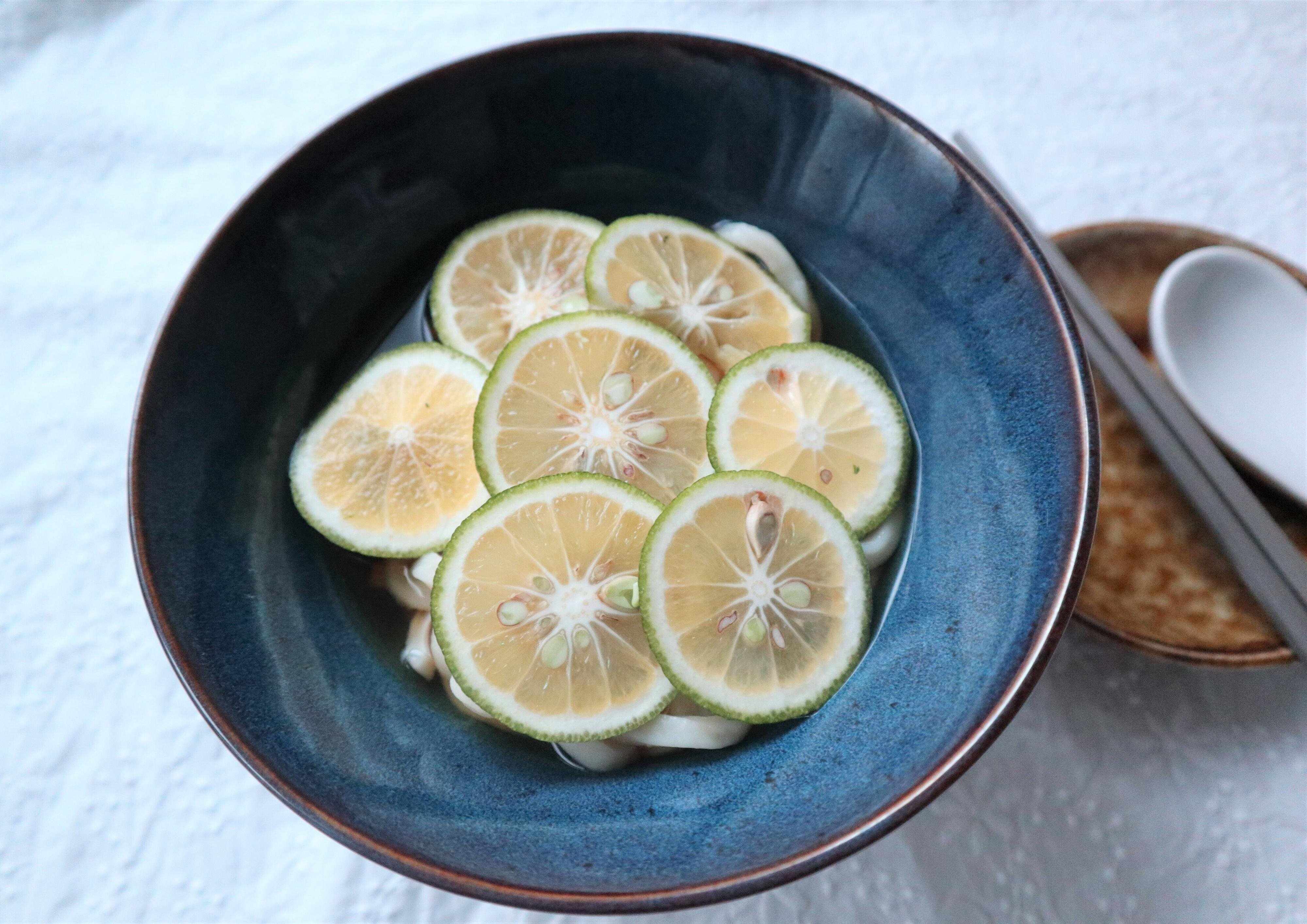 夏に冷たいカボスそばなどをよく見かけますが、温かいカボスうどんもおすすめです。器に電子レンジで加熱したうどんをいれて、お好みの濃さの麺つゆ、スライスしたカボスをのせたら完成です。爽やかな酸味でさっぱりと食べることができます。
