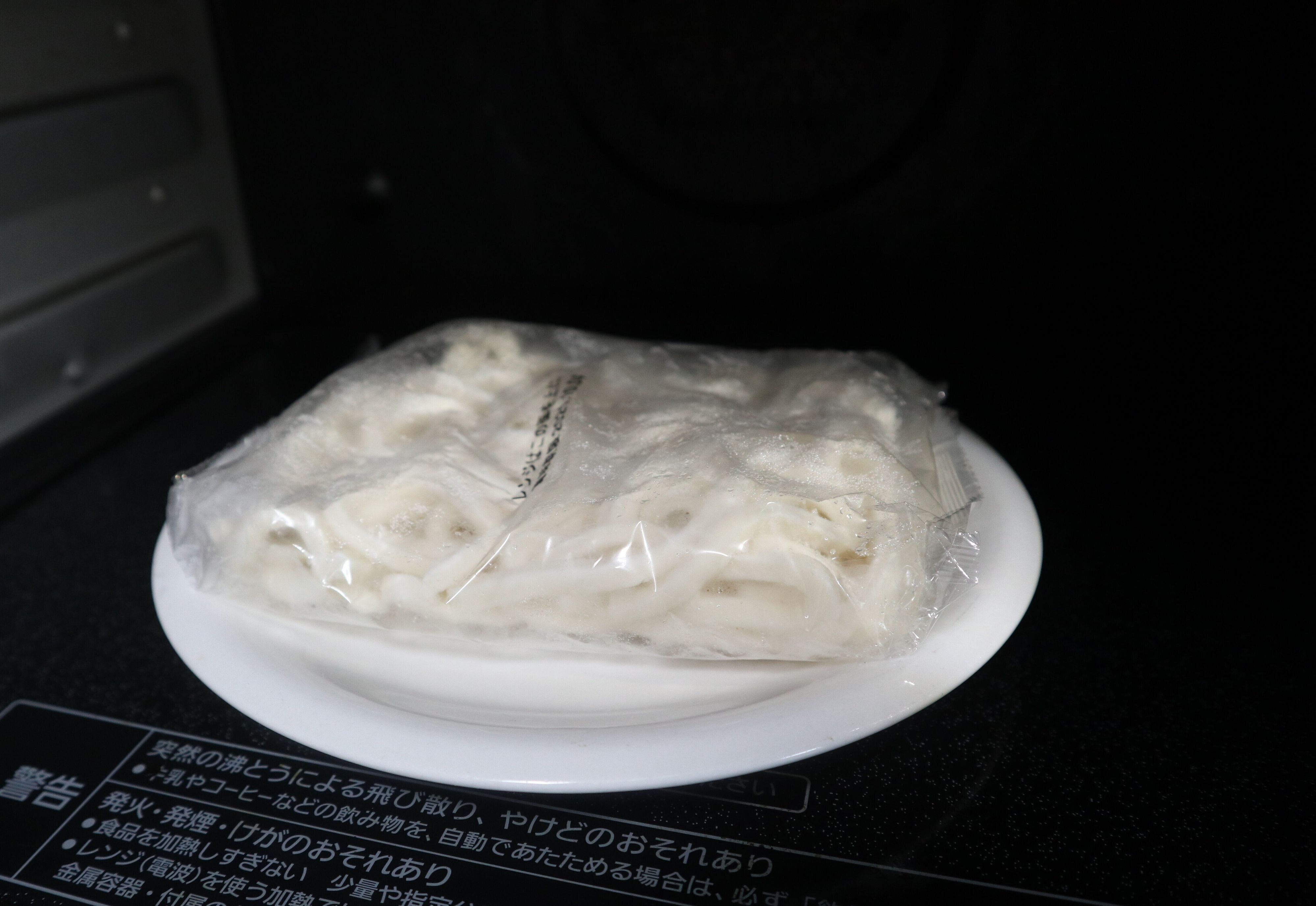 電子レンジで加熱できるのでとても便利です。凍ったままの麺を内袋のまま、表示がある麺を上にして、お皿にのせ、600Wの電子レンジで4分加熱すれば、食べられます。 鍋で茹でることもできますが、電子レンジのほうが洗いものが少なくて負担が減ります。